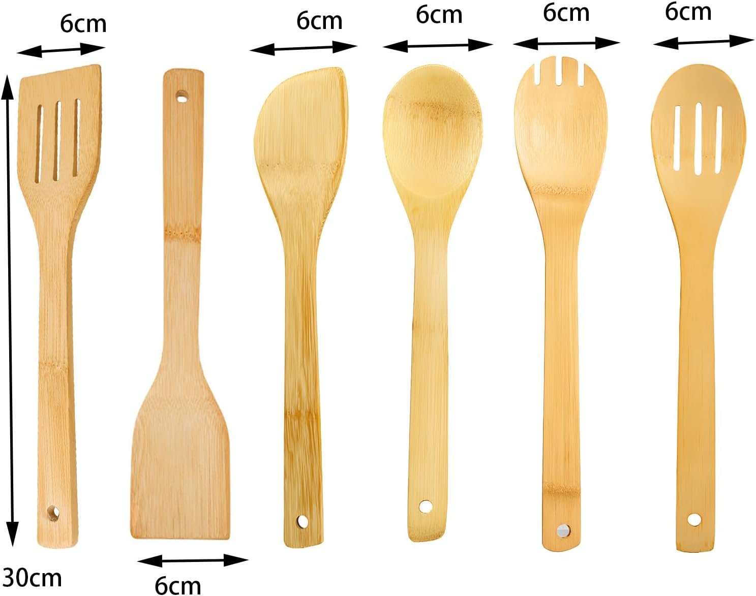 This 6-piece bamboo cooking utensils set includes a spatula, bamboo spoon, slotted spoon, fork spoon, slotted spatula, and angled spatula, each measuring 30×6 cm. Our set is designed to meet your daily cooking needs, including mixing, stirring, flipping, and serving.
