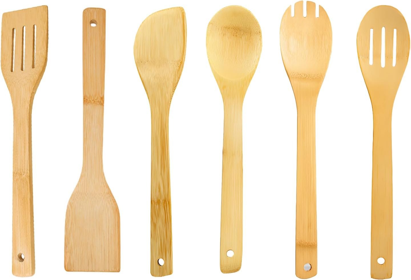 • All In One 6 Piece Set: Includes 1 spatula, 1 bamboo spoon, 1 slotted spoon, 1 fork spoon, 1 slotted spatula, and 1 angled spatula