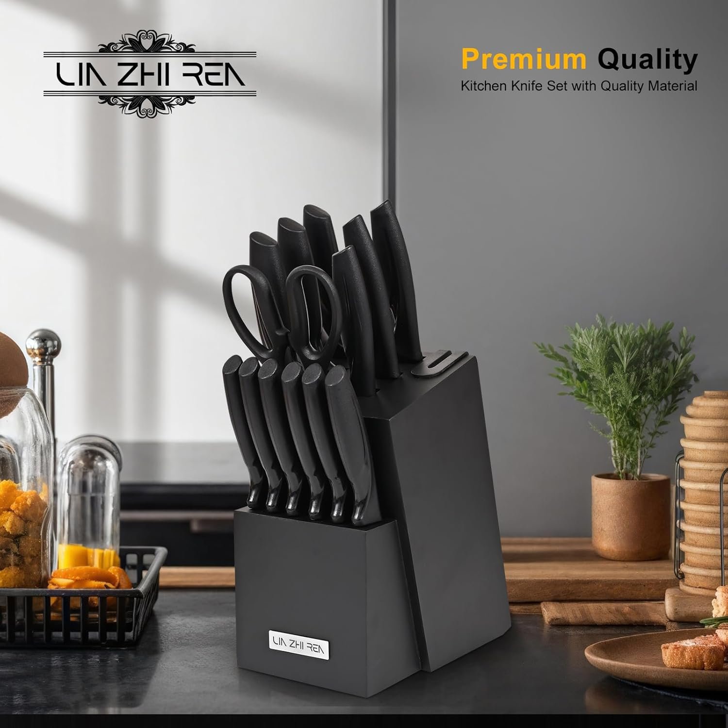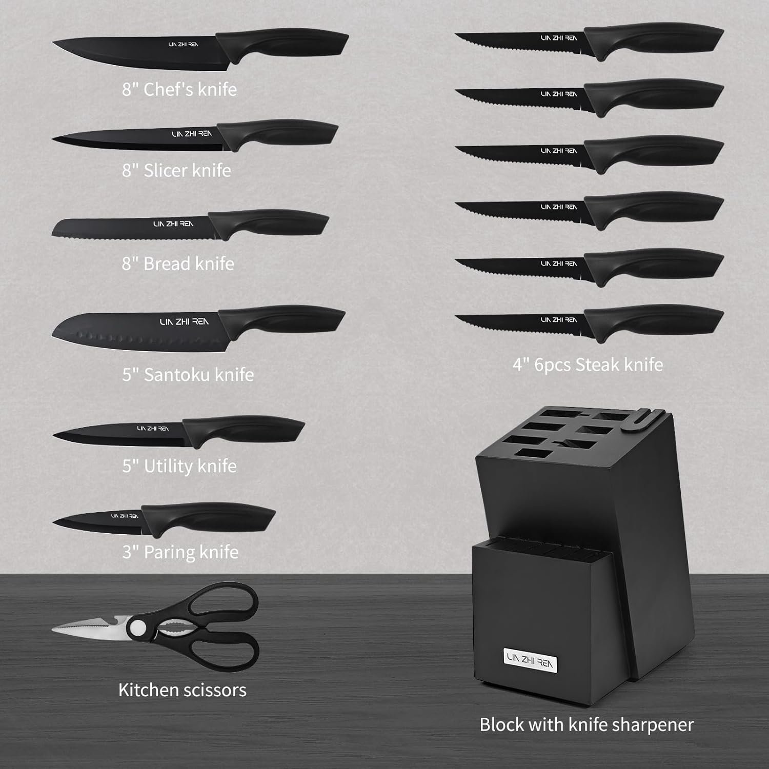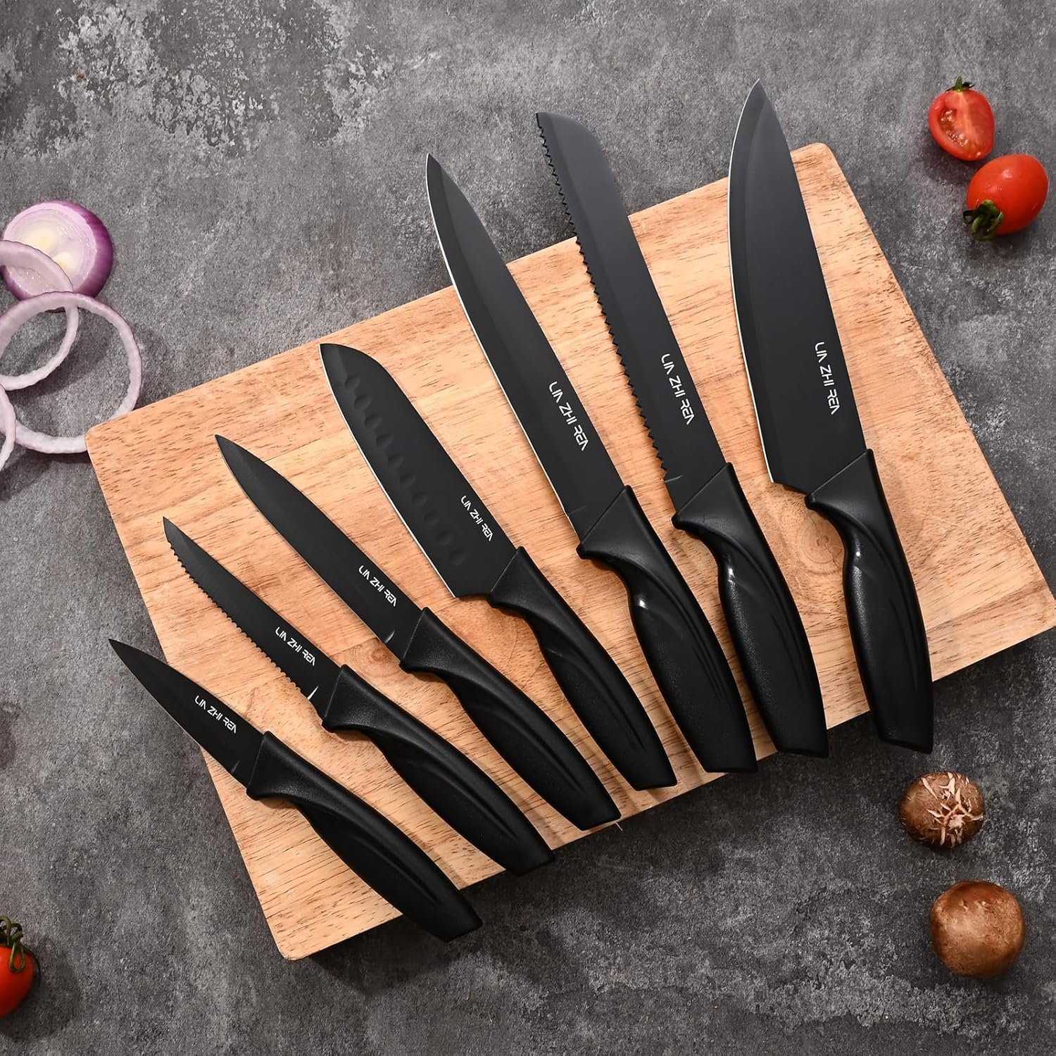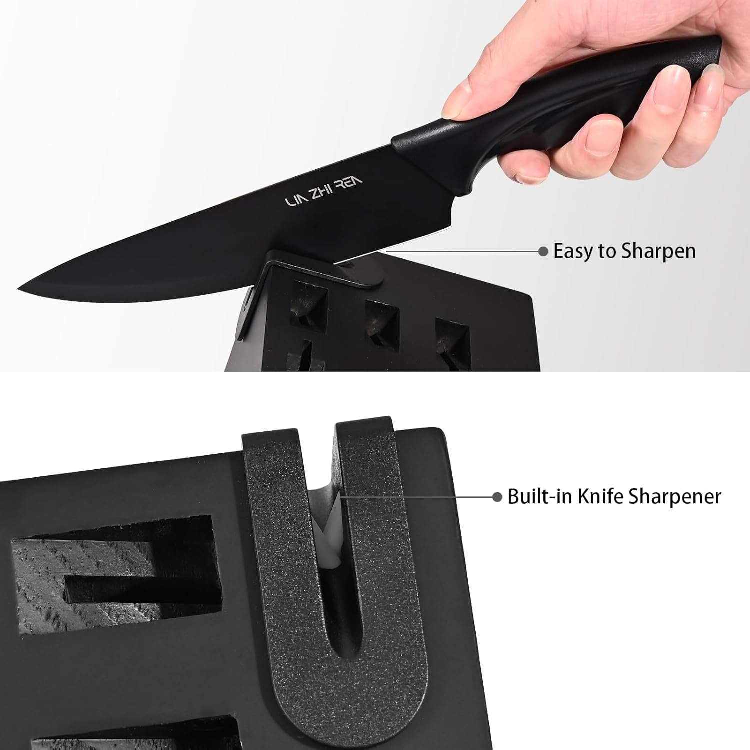 Each knife is made of high-quality stainless steel to stay sharp and durable, providing you with a reliable cooking companion. The knives are covered with black non-stick paint coating, which is easy to clean, ensuring the hygiene and safety of food ingredients. A functional wooden block not only organizes knives but also provides additional workspace and adds a pop of color to your kitchen.