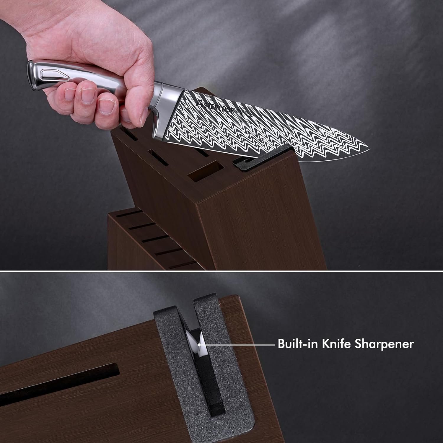 • Premium Acacia Wood Knife Block with built-in Knife Sharpener