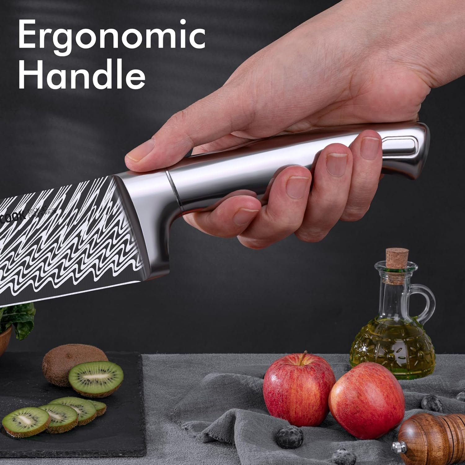 • Ergonomic Handles: The knife handles are designed to fit comfortably in any hand, making them suitable for both left-handed and right-handed users.