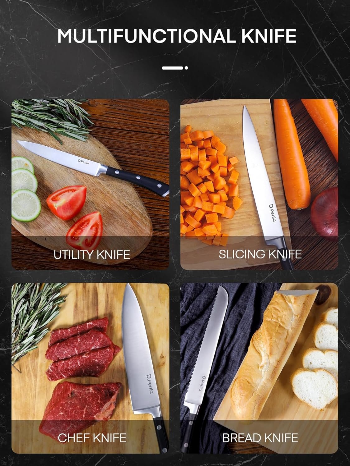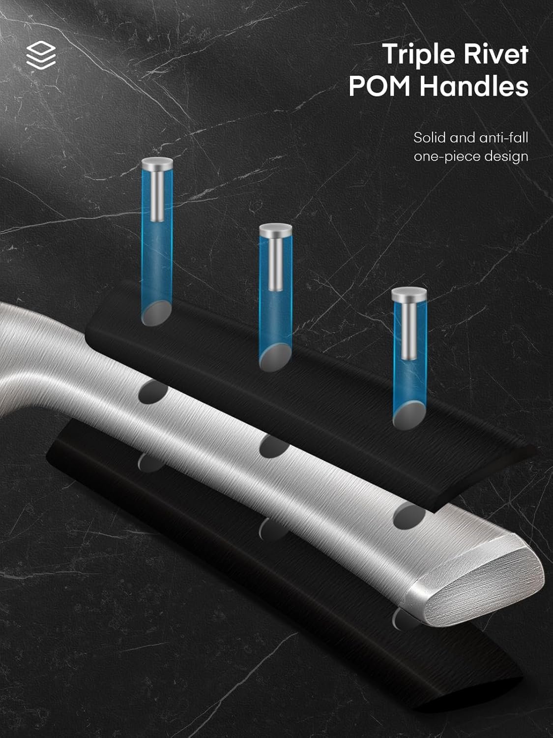 Each blade edge is 15 ° per side for precise cutting, slicing, and peeling. The set is forged from 1.4116 imported German Stainless Steel that is hard and resistant to stains and rust.