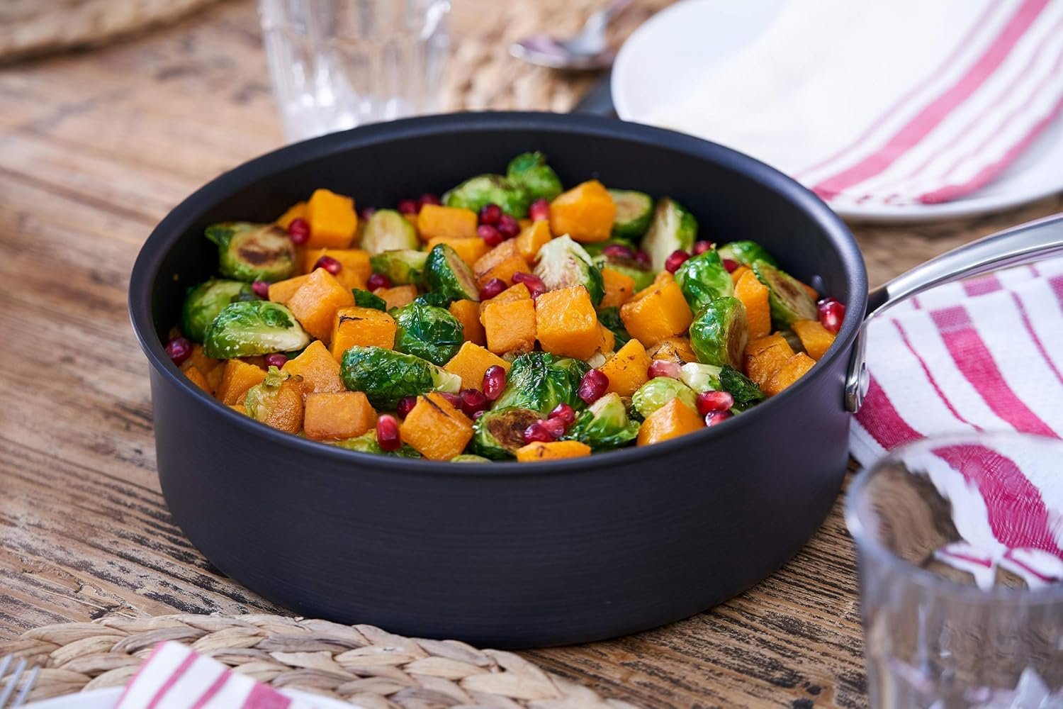 The Lagostina nera hard anodized 12 piece set is inspired by generations of passionate Italian cooking, bringing a touch of tradition and elegance to your kitchen. This cookware set features hammered stainless steel lids and cast riveted stainless steel handles, making it a stunning addition to your kitchen and table. The dual-layer, metal-utensil safe nonstick interior enhances the cooking experience, allowing for effortless food release and quick cleanup. The hammered stainless steel lids provide a tight seal, locking in flavors while simmering, and the comfortable stay-cool handles ensure strength and stability over a lifetime of use.
