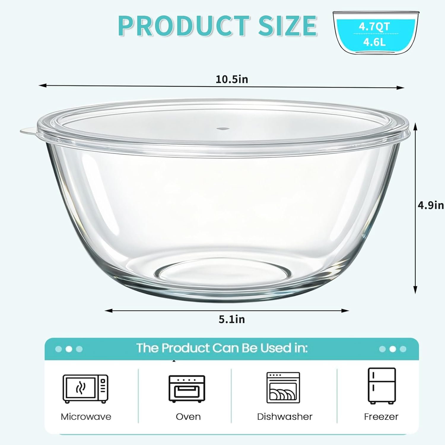 Overall, this 4.7-quart glass bowl is an excellent choice for anyone looking for a reliable and stylish kitchen essential. Its heat-resistant, easy-to-clean, and long-lasting design make it perfect for a variety of tasks, from bread making to salad preparation and baking.