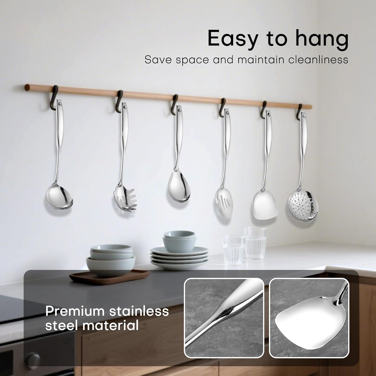 Our kitchen utensil set is made from durable, rust-resistant 304 stainless steel with a sleek metal finish, giving your kitchen a modern and professional look.