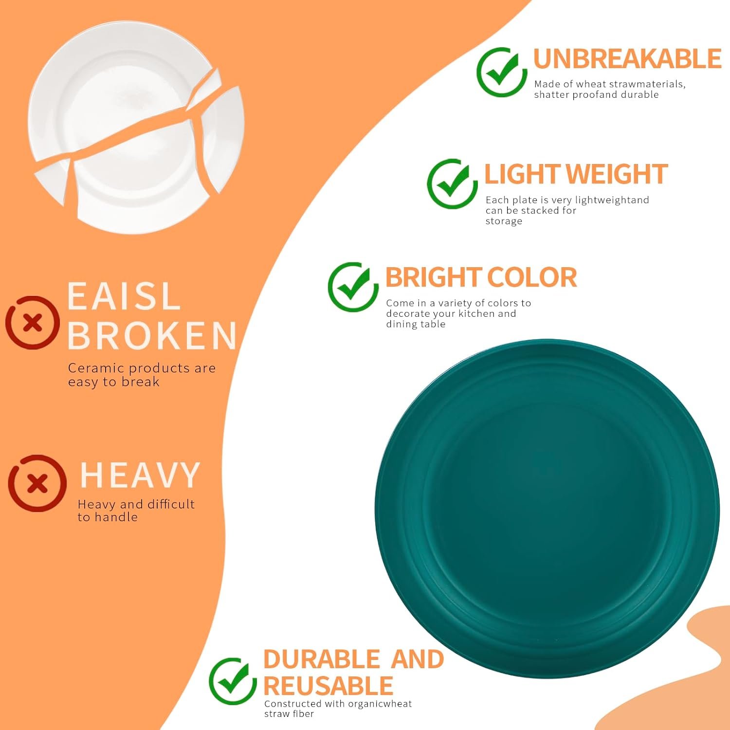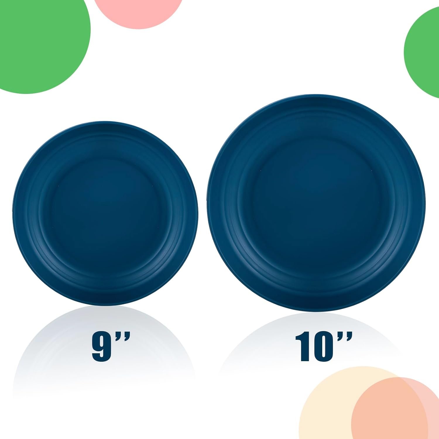 Our wheat straw plates come in 5 colors: orange, yellow, blue, green, and black. They are designed to be used as dinner plates, party plates, birthday party plates, picnic plates, etc. Each color will give you a lot of fun while you use the colorful plastic plates, and your family will love them too.