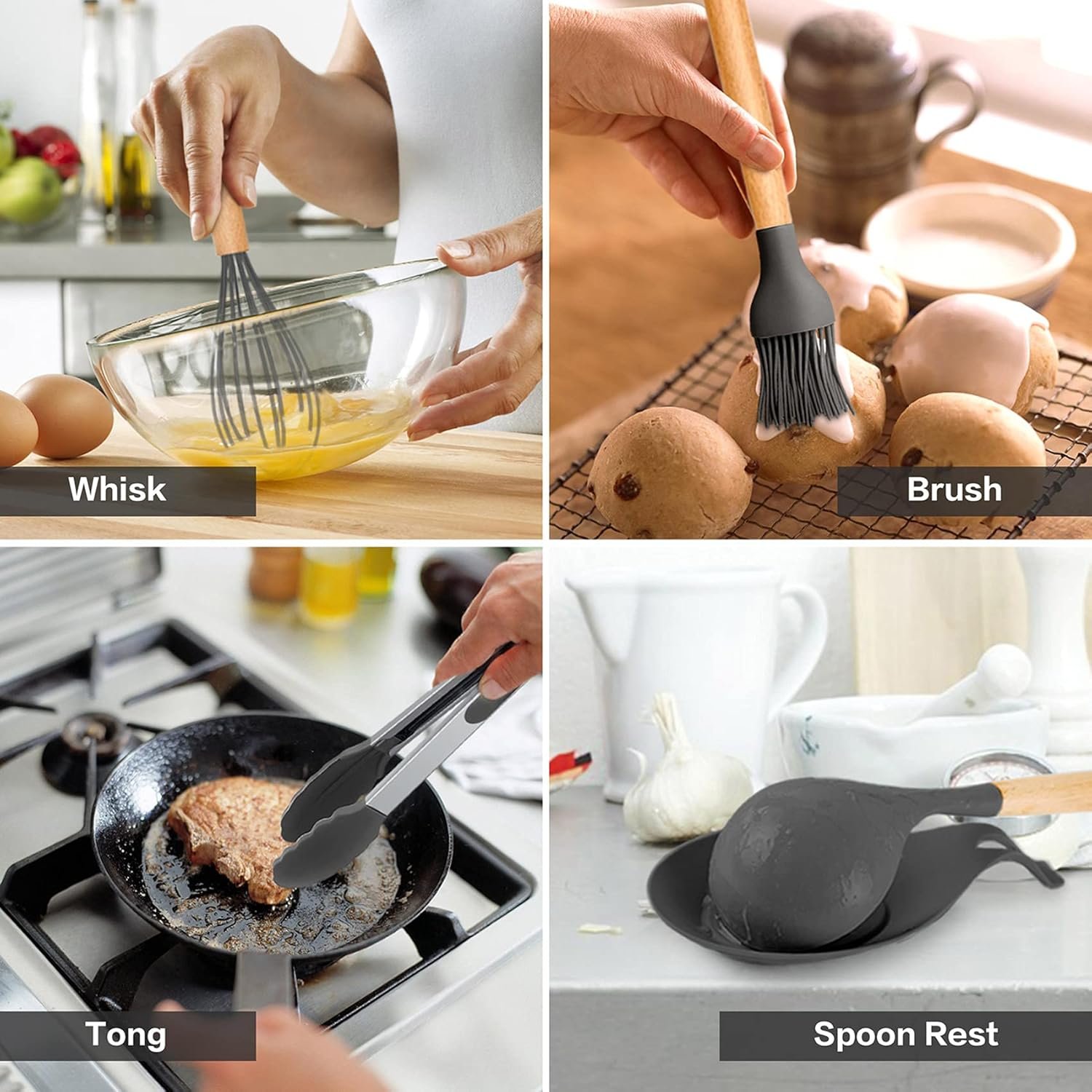 This set is ideal for anyone looking for a comprehensive and durable kitchen utensils set. The premium silicone material ensures healthy cooking, and the heat-resistant design makes it perfect for frying, grilling, mixing, baking, scooping, whisking, stirring, and basting. The smooth wooden handles provide good heat insulation, protecting your hands from scalding during cooking.