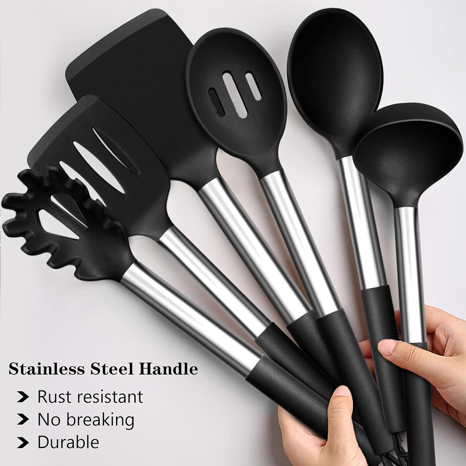 Made from food-grade silicone material, non-toxic and heat resistant up to 446°F. The soft handle with a stainless steel core inside is rust-free and durable. The set is dishwasher safe and easy to clean by hand. The modern look can decorate your kitchen counter well, and the non-stick cookware won’t damage your pots or pans. Hanging loops and a holder make storing all your kitchen gadgets easy.