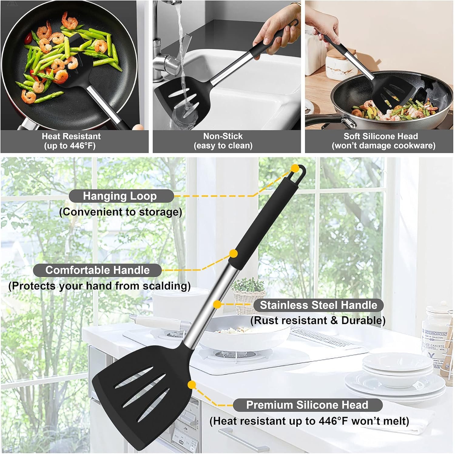 Our kitchen utensils set is crafted from premium silicone, non-toxic and safe for everyday cooking. The silicone is heat resistant up to 446°F, with no melting or deforming.