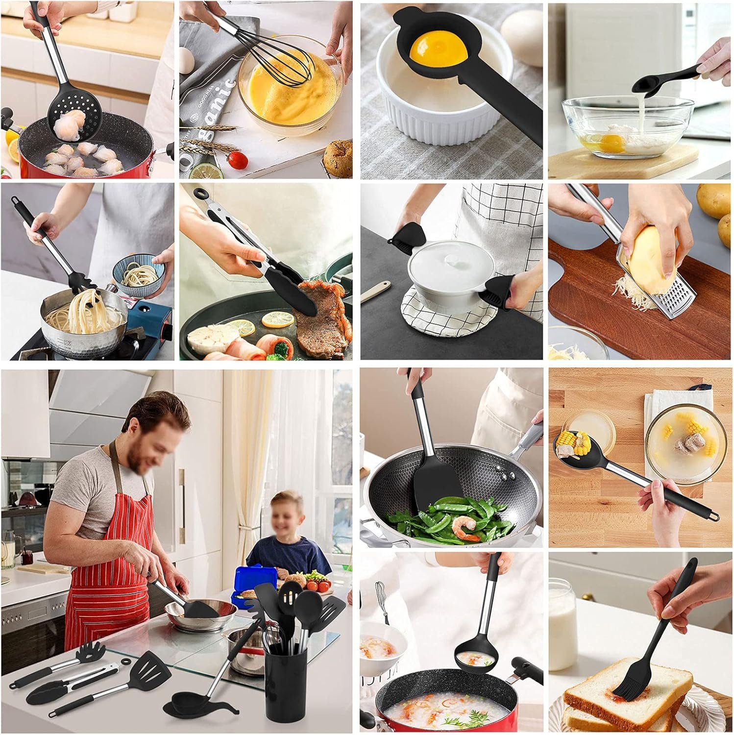 This comprehensive kitchen utensils set includes all the basic tools you need for cooking, made from food-grade silicone with stainless steel handles, ensuring safety and durability for years to come. The soft and flexible surface won’t damage your pots or pans, and the set is easy to clean and dishwasher safe. The included plastic holder makes storing your kitchen tools convenient.