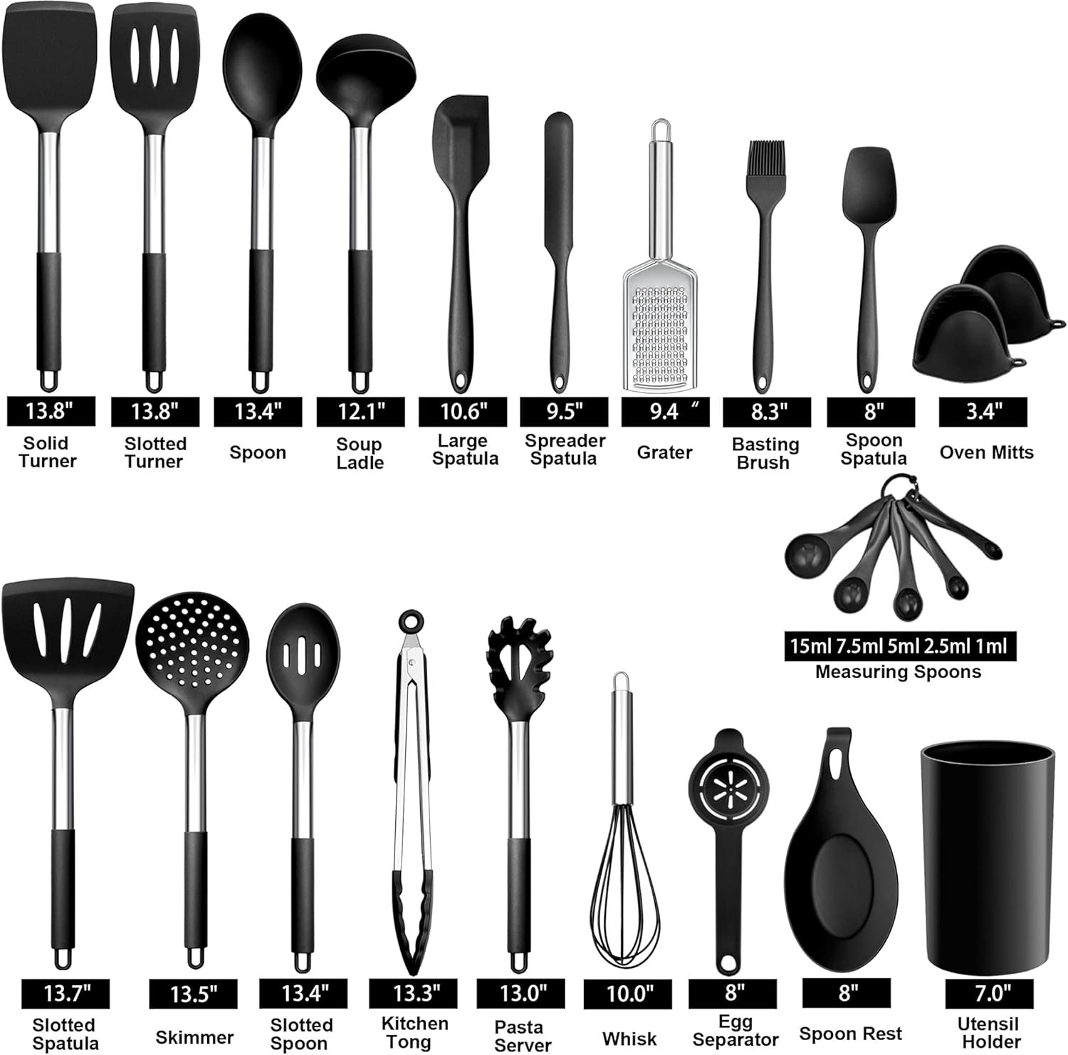 This 35-piece kitchen utensils set contains a variety of tools, including slotted spatula, skimmer, pasta server, slotted spoon, spoon, soup ladle, slotted turner, turner, kitchen tong, whisk, spatula, spreader spatula, spoon spatula, basting brush, spoon rest, grater, 2pcs oven mitts, egg separator, 5pcs measuring spoons, 10pcs S-shaped hooks, and a utensils holder. These tools are suitable for cooking, mixing, grilling, baking, and are ideal for families, friends, housewarming, weddings, and Christmas.