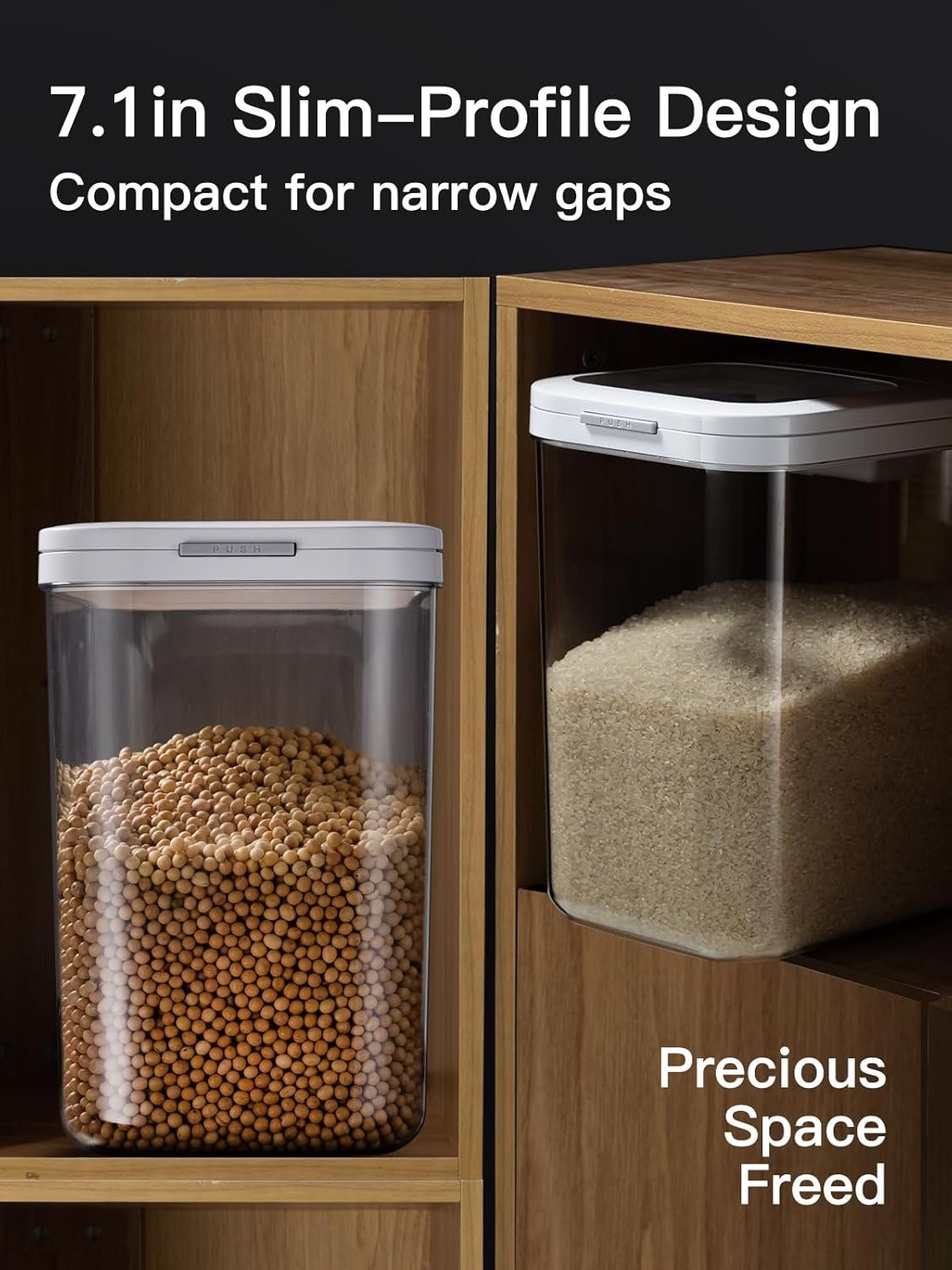 - 7.1in Slim Space-Saving Design: Maximize pantry, fridge, or countertop space! Our compact large flour storage container and rice organizer fit snugly in tight spots, efficiently utilizing vertical space while holding ample bulk supplies.