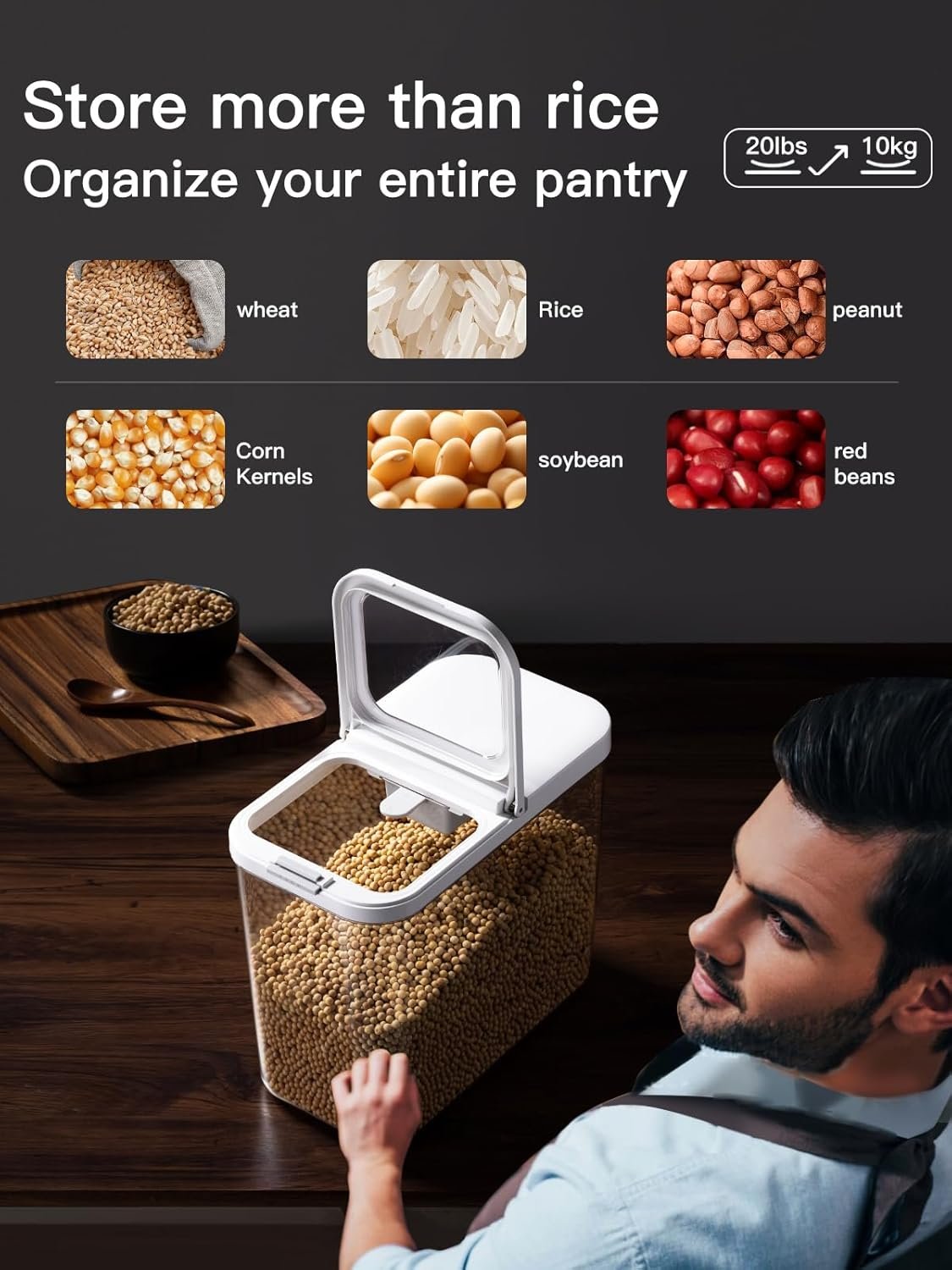 - Instant One-Hand Access: Open your rice storage container in one second, even with full hands!