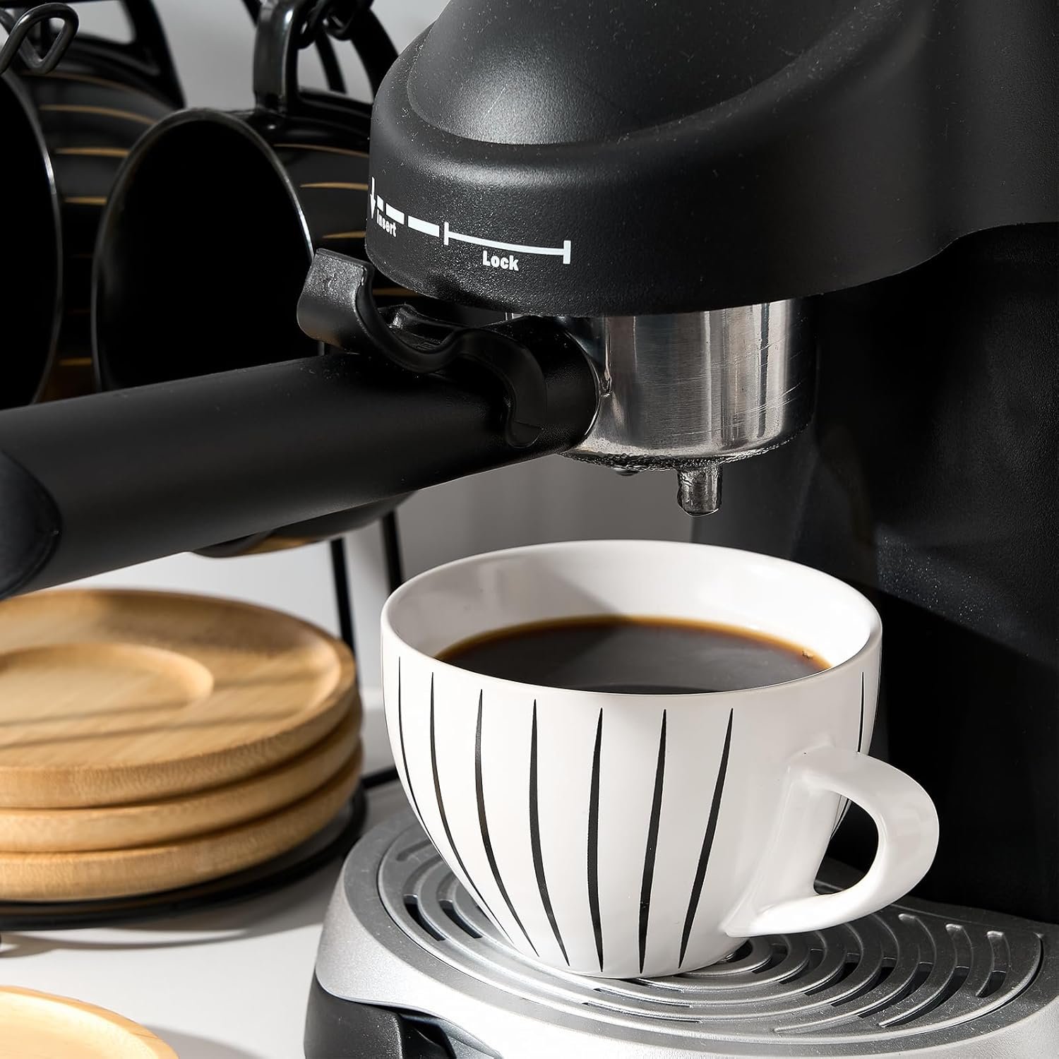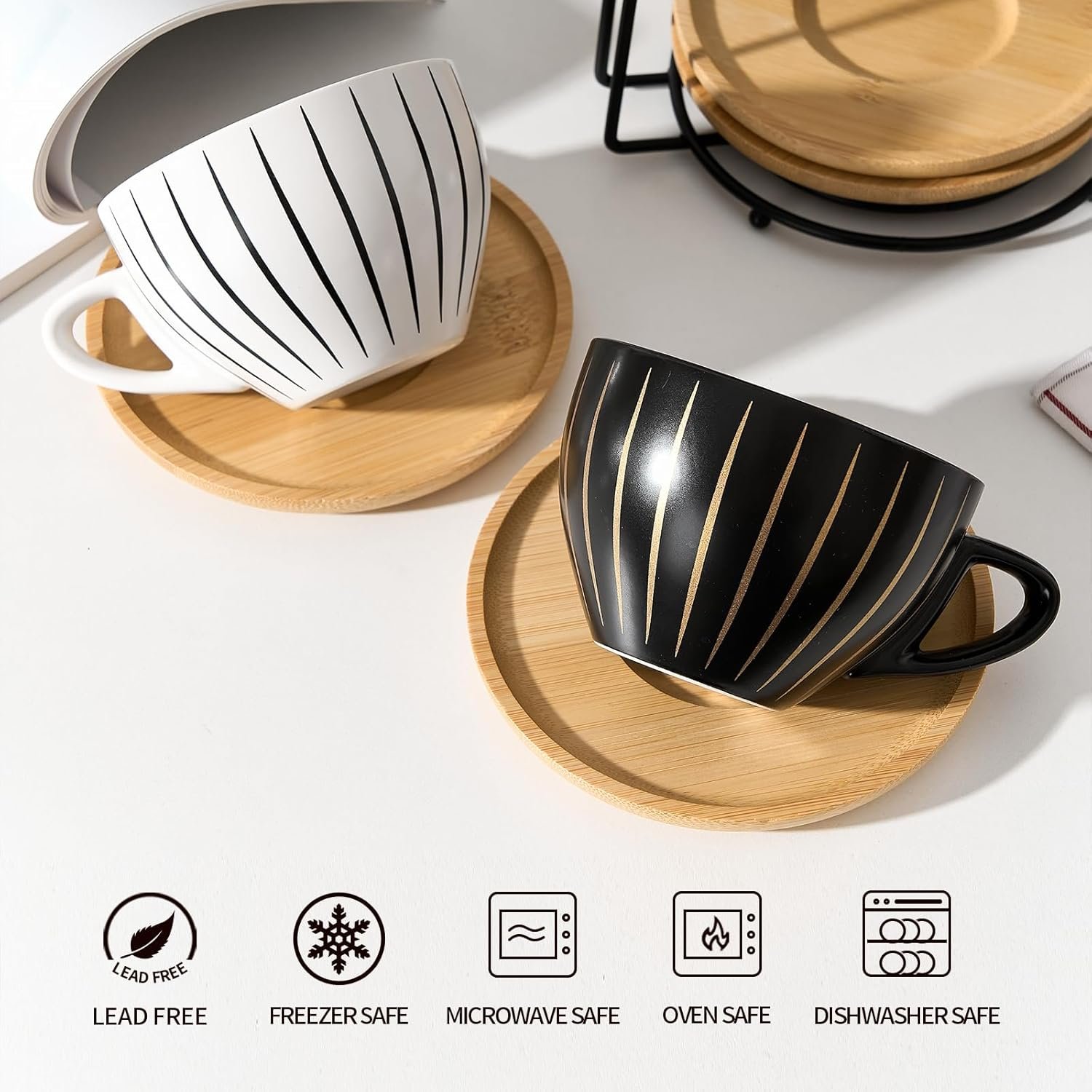 Home Dinnerware LUKA Ceramic Demitasse Espresso Cups Set with Saucers and Metal Stand, 8 oz Porcelain Cappuccino Cups Teacup For Tea, Espresso, Latte, Coffee, Cafe Mocha, Set of 4, Stripe White & Black