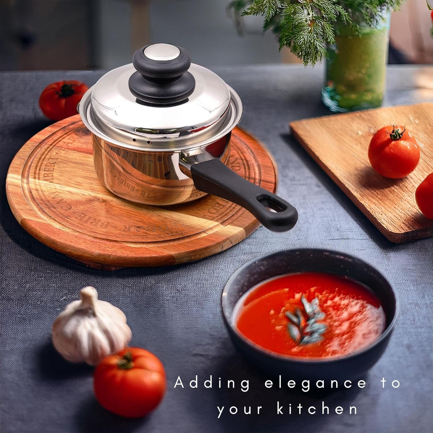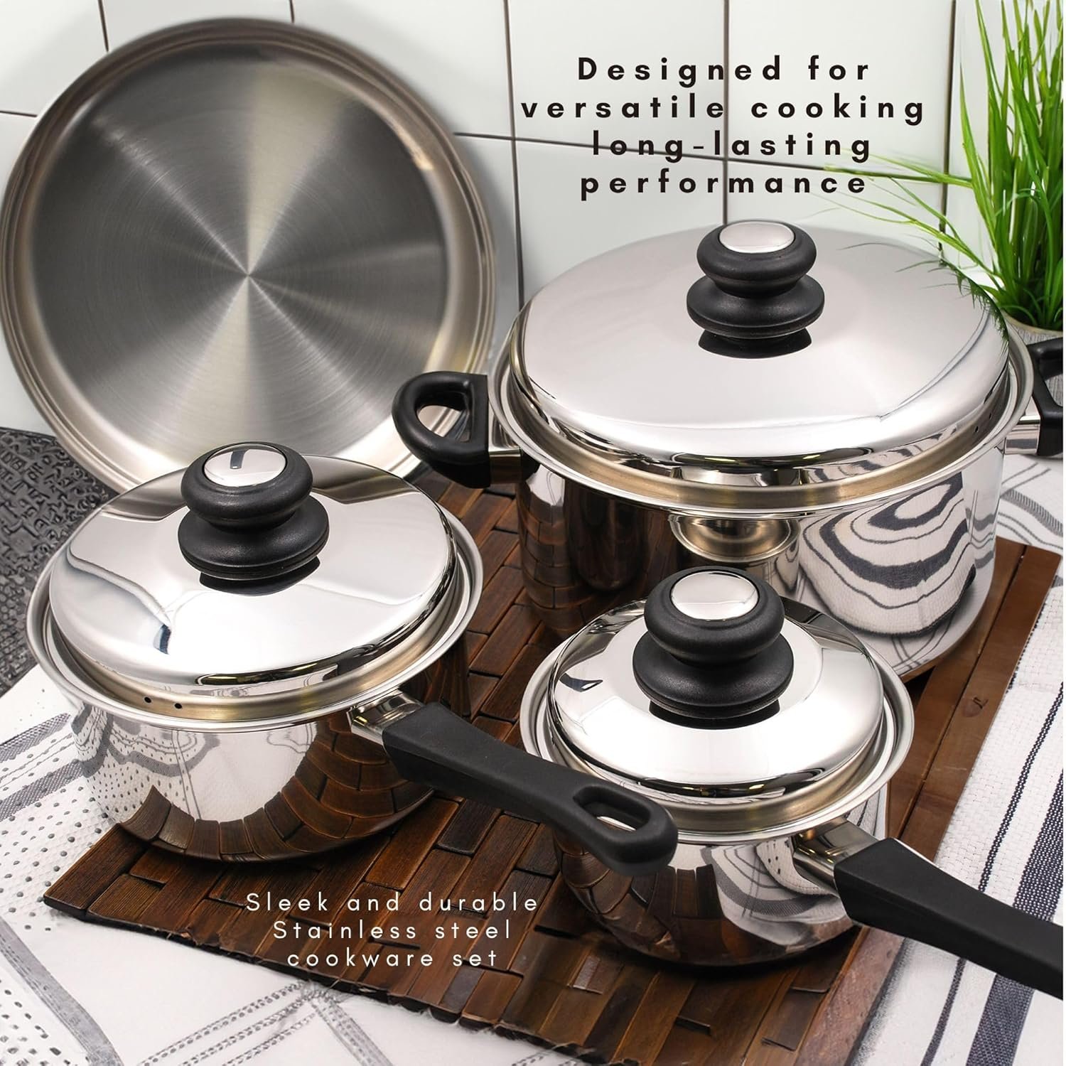 This cookware set is made from high-quality stainless steel, built to last and resistant to warping, rusting, and staining. It features even heat distribution, a sleek polished finish, and is compatible with all stovetops, including induction.