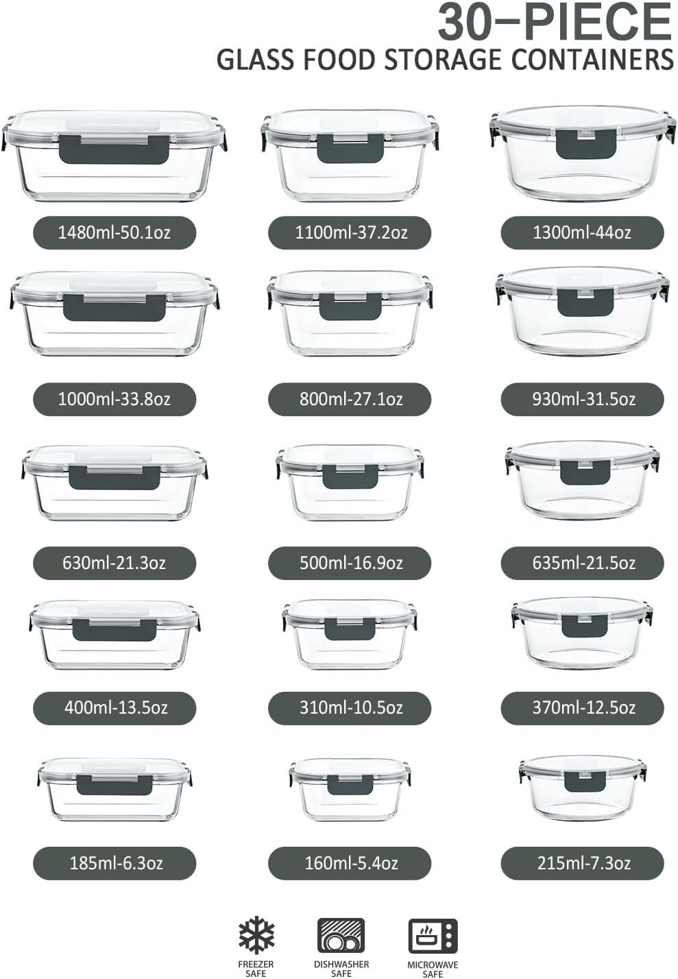 Our 30-piece food container set is designed to fulfill your storage requirements, with 15 containers and 15 lids in multiple sizes and shapes. The package includes containers of various capacities: 1 (50.1 oz), 1 (33.8 oz), 1 (21.3 oz), 1 (13.5 oz), 1 (6.3 oz), 1 (37.2 oz), 1 (27.1 oz), 1 (16.9 oz), 1 (10.5 oz), 1 (5.4 oz), 1 (44 oz), 1 (31.5 oz), 1 (21.5 oz), 1 (12.5 oz), and 1 (7.3 oz), each with a corresponding lid.
