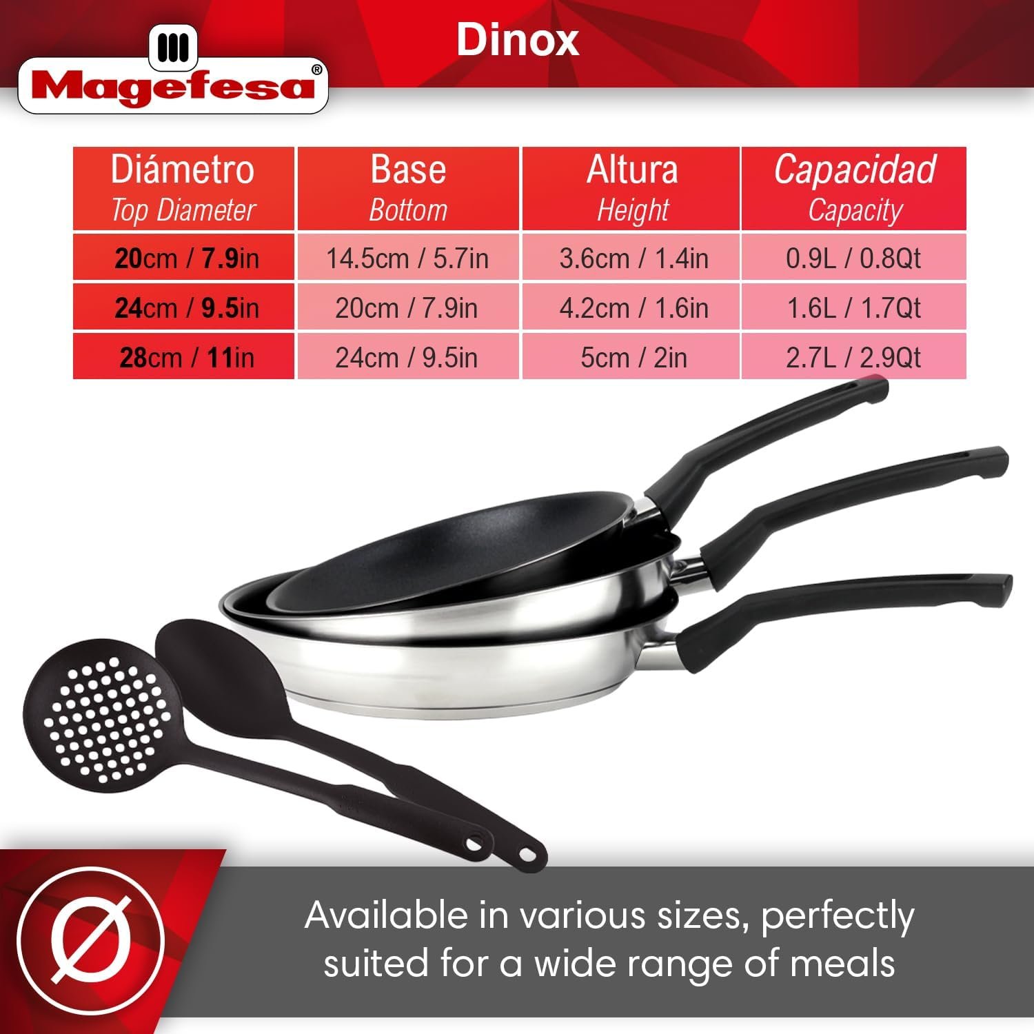 MAGEFESA Dinox Non-Stick Stainless Steel Frying Pan Set – 5-Piece (7.9″, 9.4″, 11″) + Skimmer & Serving Spoon, XYLAN PLUS Coating, Induction, Gas & Electric Safe, Even Heat, Cool-Touch Handle