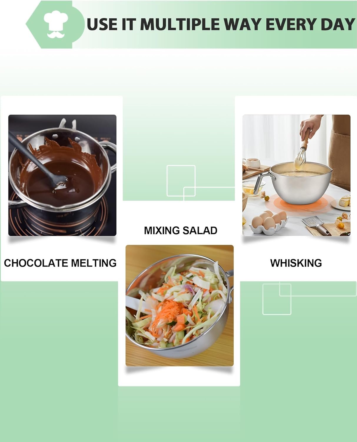 • Perfect for mixing large batters, tossing salads, melting chocolate, and more