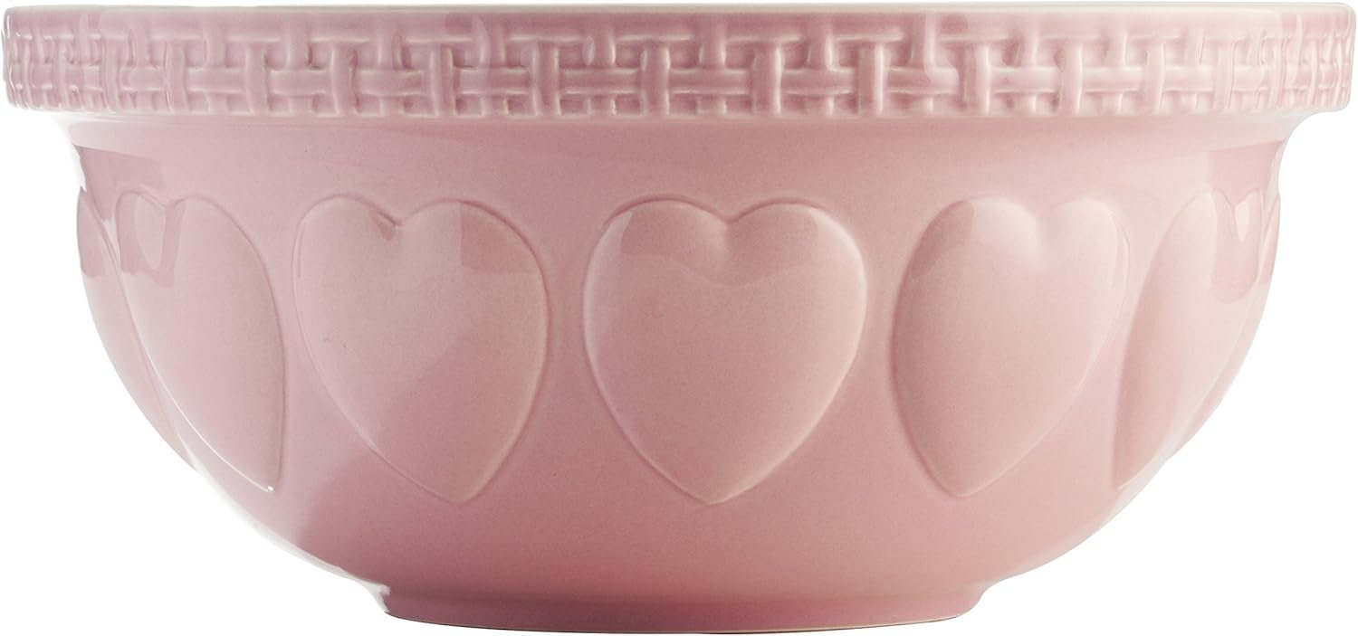 The Mason Cash 29cm Pink Hearts Mixing Bowl is a charming addition to any kitchen, featuring embossed hearts around the outside that not only add a touch of elegance but also provide a secure grip while mixing and beating. The bowl’s white interior ensures easy cleaning, making it a practical choice for home bakers.
