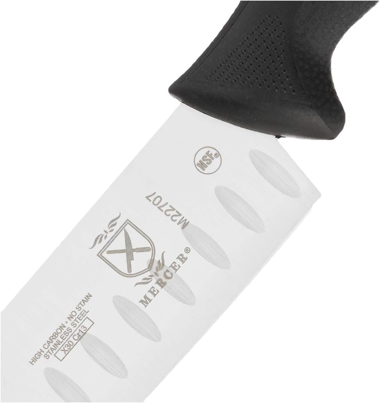 The M23210 has a 10-inch wavy-edge blade (HRC 53–54) and a textured Santoprene/polypropylene handle. Weighing ~200 grams (7 oz), the stamped knife is lightweight and NSF-certified.