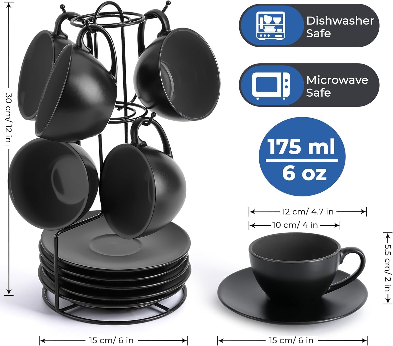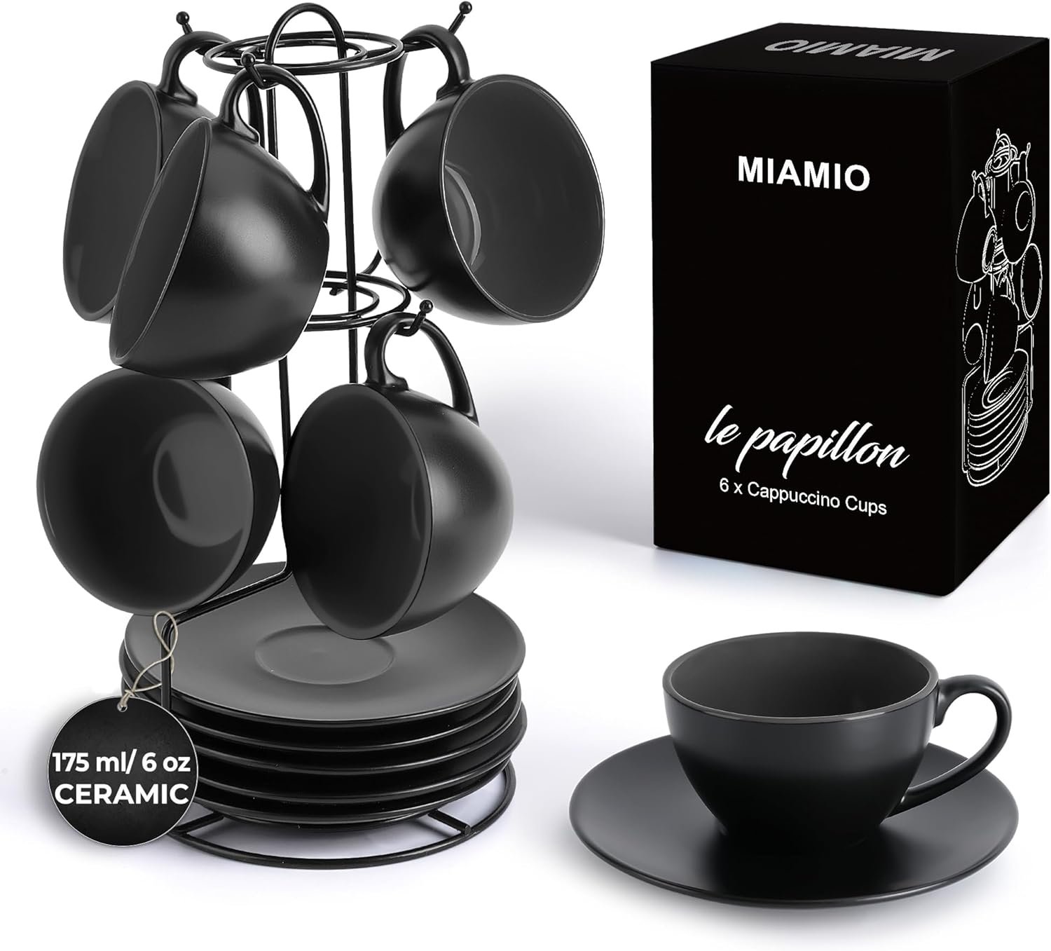 Home Dinnerware MIAMIO – Set of 6, Ceramic Stackable Cappuccino Cups Set / 6 Ounce Cappuccino Mugs and Saucer with Metal Stand for Coffee Drinks, Cafe, Latte, Americano and Tea – Le Papillon Collection (Black)