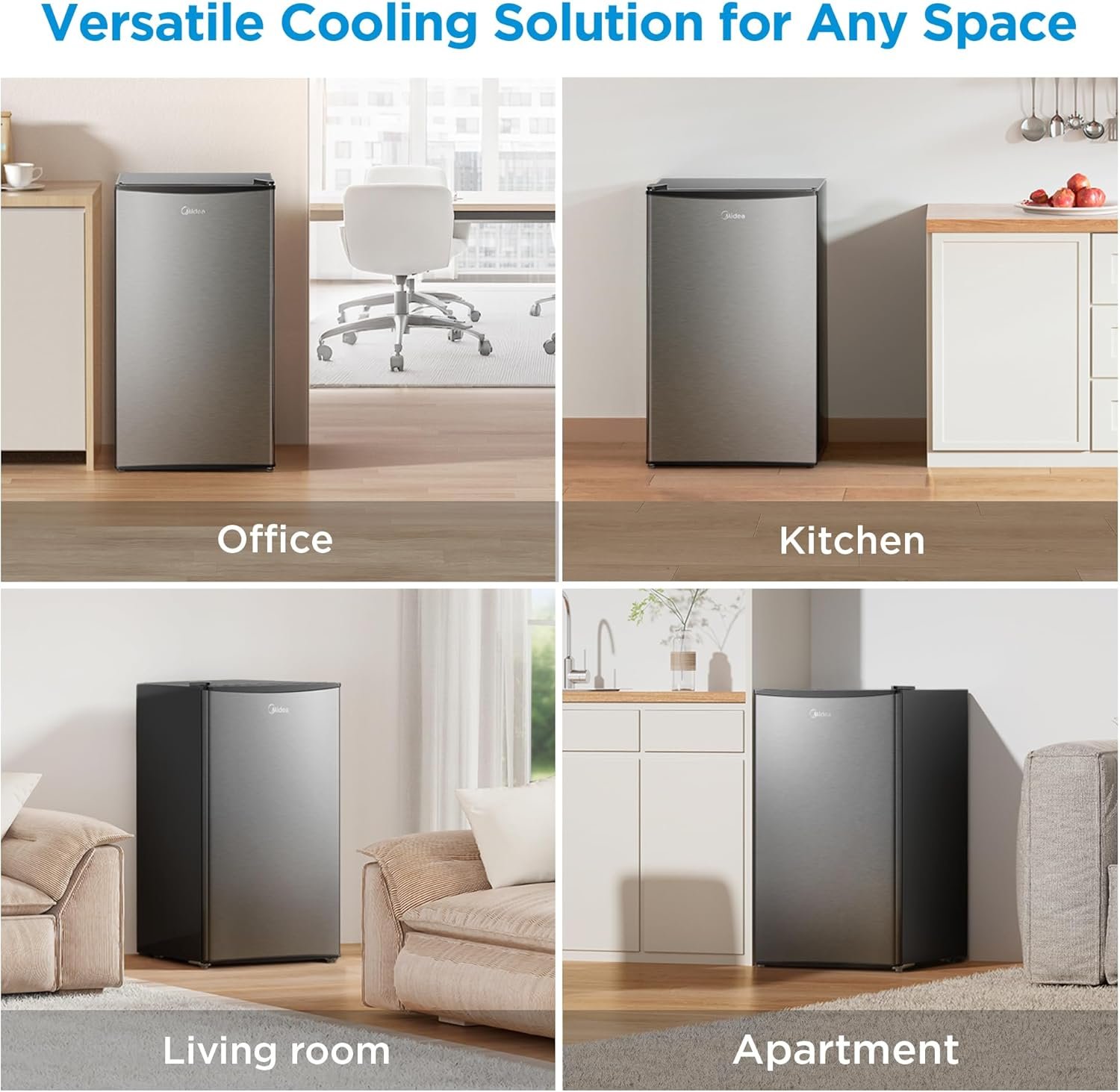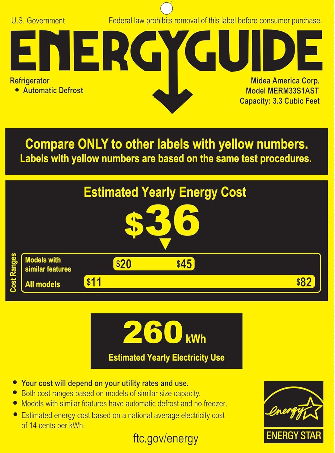 The Midea MERM33S1AST mini fridge is a space-saving and generous capacity refrigerator, perfect for keeping your favorite beverages cool and fruits or other food fresh. With its 18.7*17.6*34 inches (W*D*H) measurement and 3.3 cu.ft refrigerator capacity, it takes up minimal space in your garage, apartment, dorm, or kitchen.