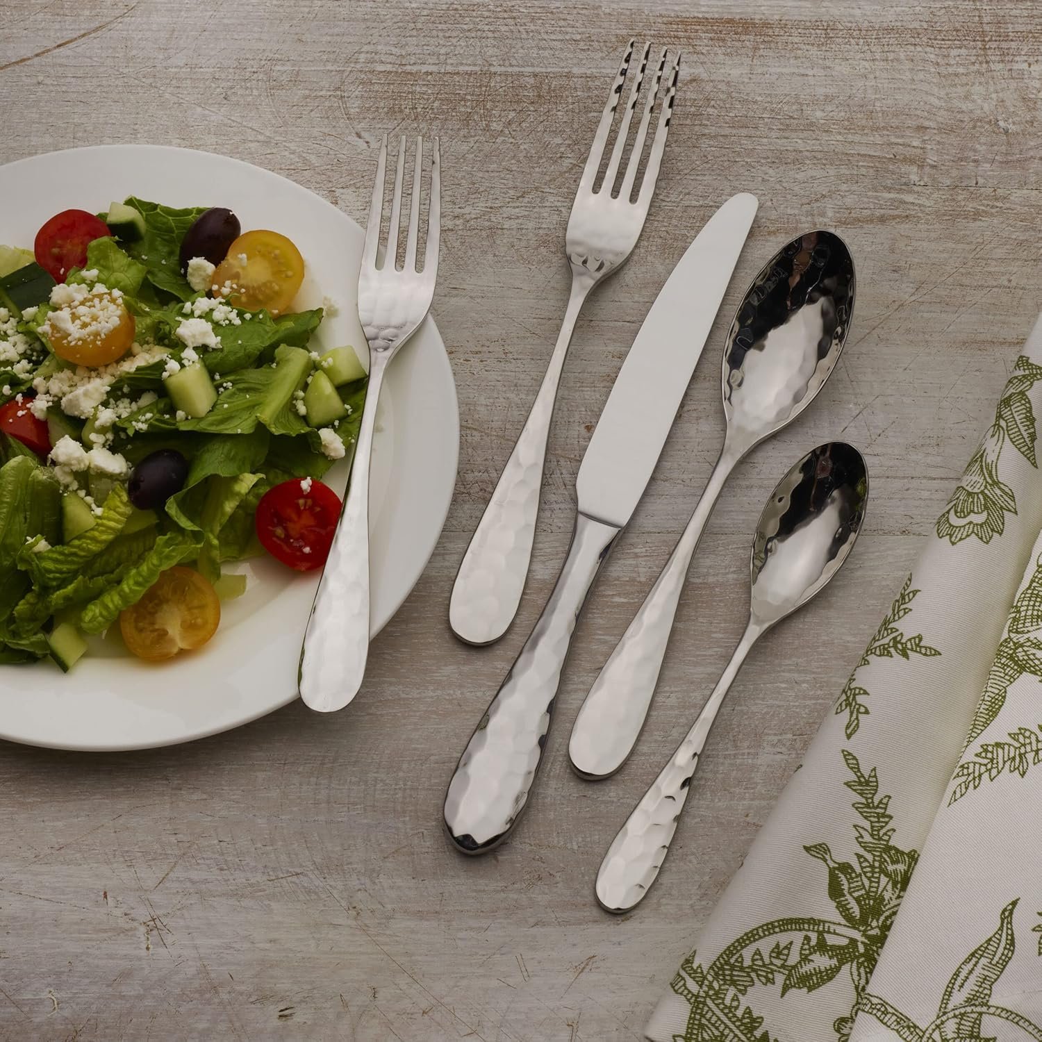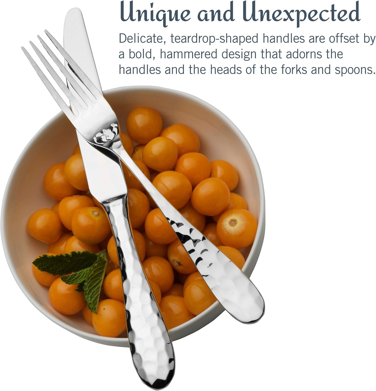 The Lilah flatware set features a traditional teardrop handle shape that tapers to a narrow neck, but with a modern twist. The delicate silhouette is offset by a bold hammered design that adorns not only the handle of each piece but also subtly covers both the tines of the forks and the bowls of the spoons. The set is beautifully crafted from 18/10 stainless steel, ensuring long-lasting brilliance and shine. The 45-piece set includes: