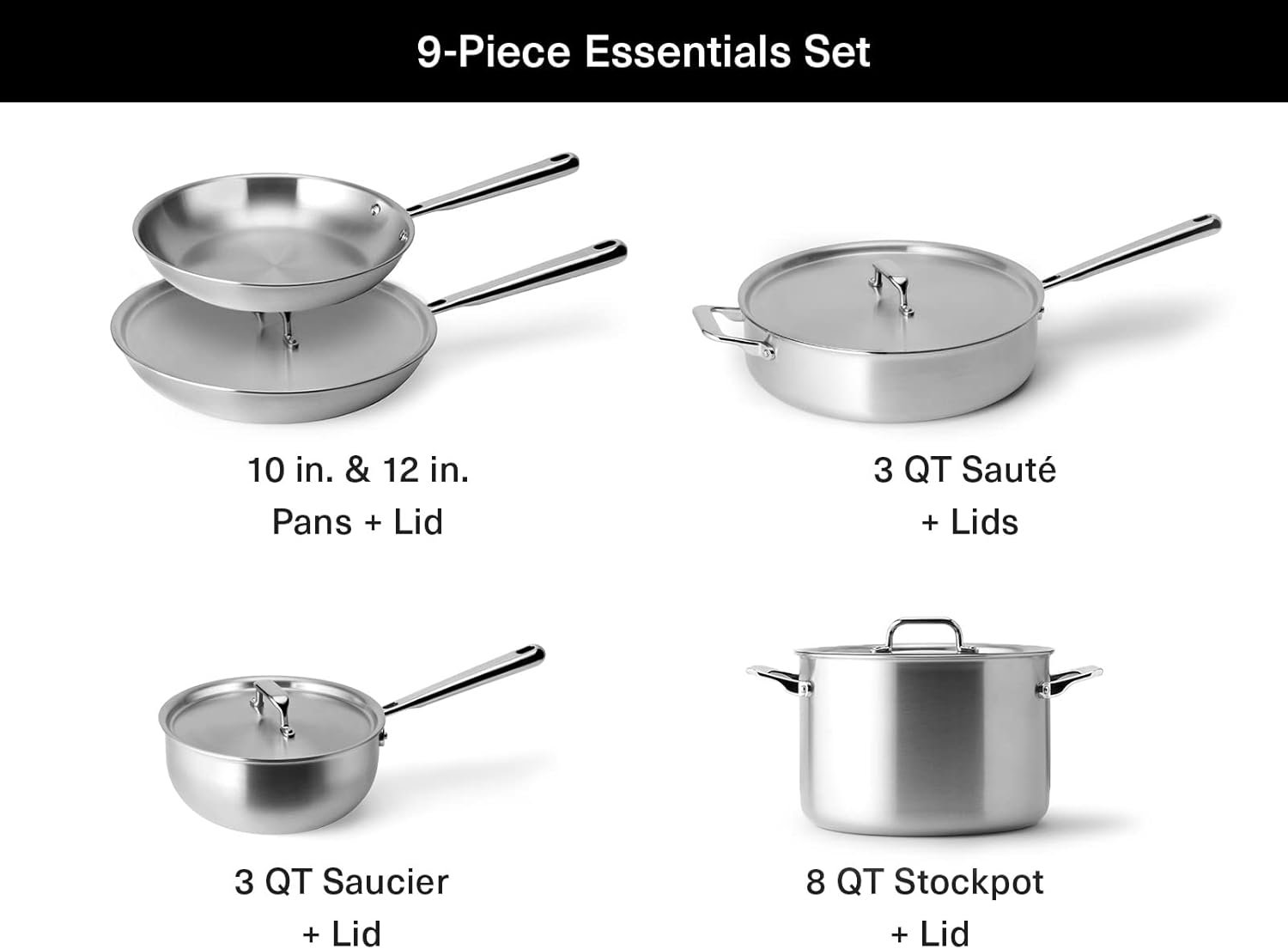 Misen 5-Ply Stainless Steel Cookware Set – Versatile, Dishwasher Safe – 9-Piece Set – 10″ Skillet, 12″ Skillet + Lid, 3 QT Saute Pan + Lid, 3 QT Saucier + Lid, 8 QT Stockpot + Lid
