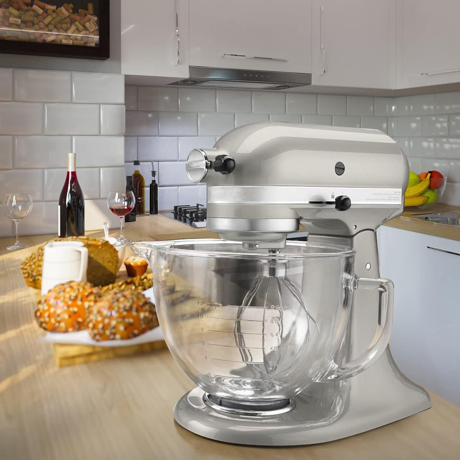 This 5 quart stand mixer bowl is made of thick glass, making it easy to clean and durable. The clear design allows you to see the contents of the bowl, ensuring that everything is thoroughly mixed. The bowl is compatible with Kitchenaid 4.5 and 5 quart tilt-head stand mixers, including models such as KSM75, KSM90, KSM95, KSM100, KSM103, KSM110, KSM150, 5KSM125, 5KSM150, 5KSM175, 5KSM7580, RRK150, K45, K45SS, and more.