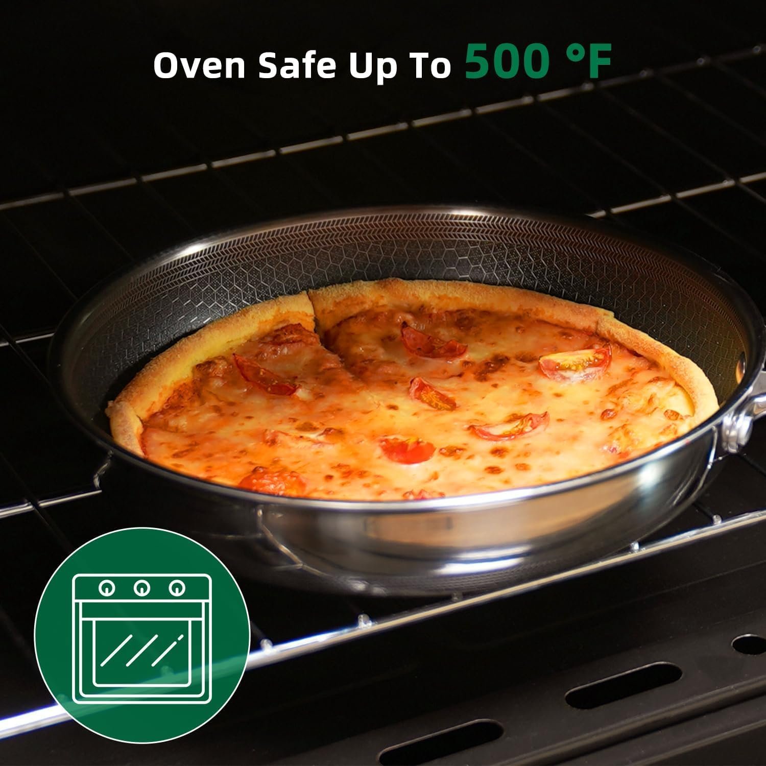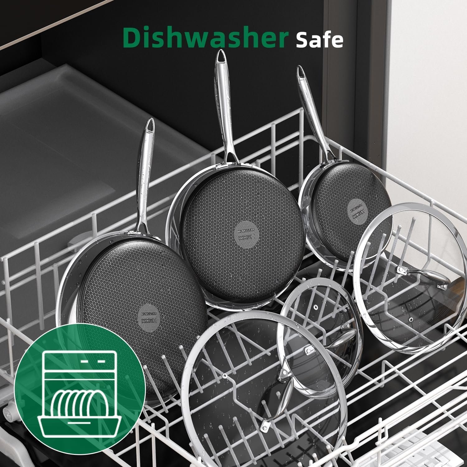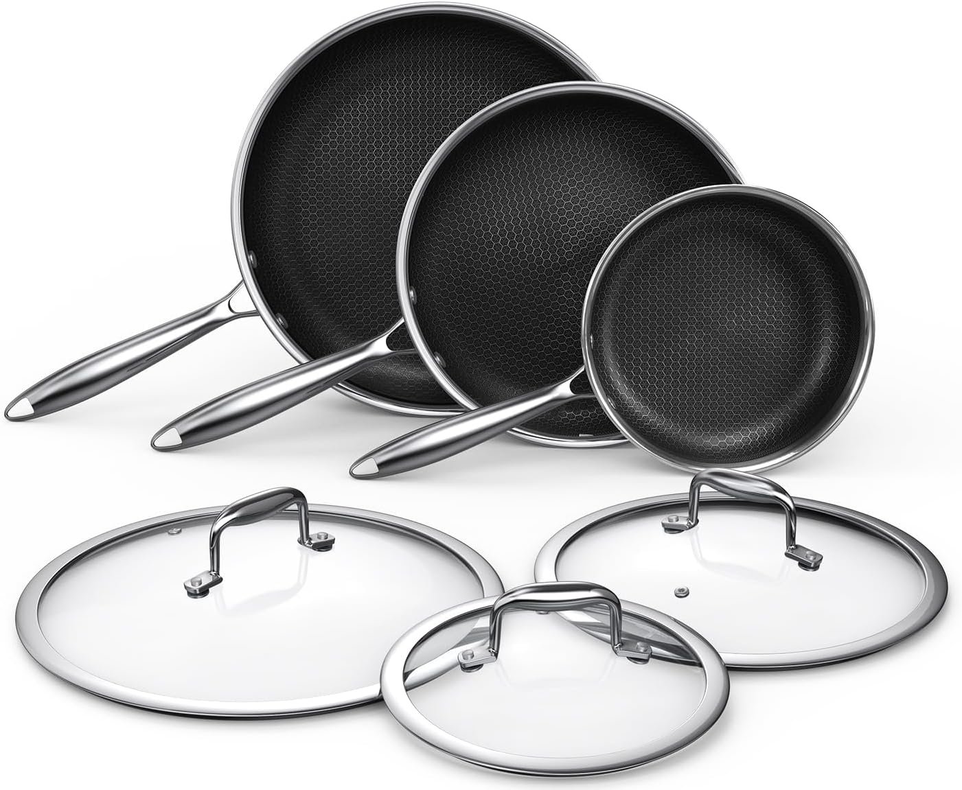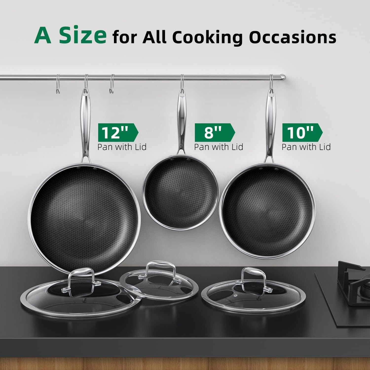 This frying pan set includes three sizes – 8", 10", and 12" – to suit all your cooking needs, from frying to sautéing to simmering. MOMOSTAR’s patented hybrid technology combines tri-ply construction with a laser-etched hexagonal nonstick surface, delivering the searing power of stainless steel, resistance to metal utensils, and the easy cleanup of nonstick.