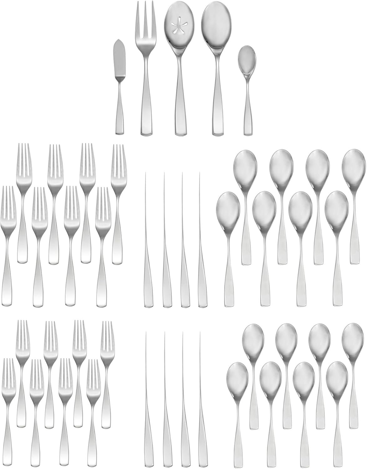 - Product Specifications: The set includes 45 pieces, with eight 5-piece place settings, one 3-piece hostess set, one butter knife, and one sugar spoon, all forged from 18/10 stainless steel and dishwasher safe.