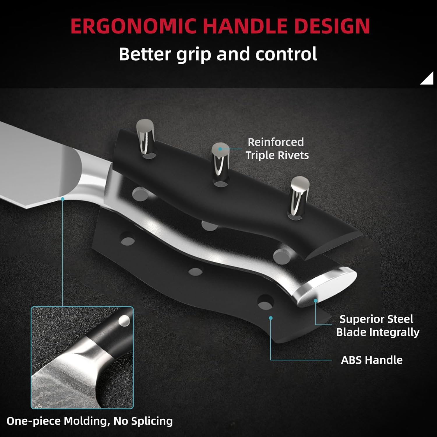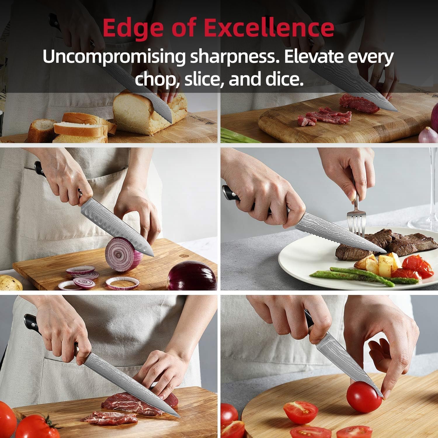 We offer a comprehensive all-in-one set that includes 8” Chef Knife, 8” Slicing Knife, 8” Bread Knife, 7” Santoku Knife, 5.5” Utility Knife, 3.5” Paring Knife, Kitchen Shears, and Knife Sharpener, all neatly organized in a beautiful 8 slots wood block.
