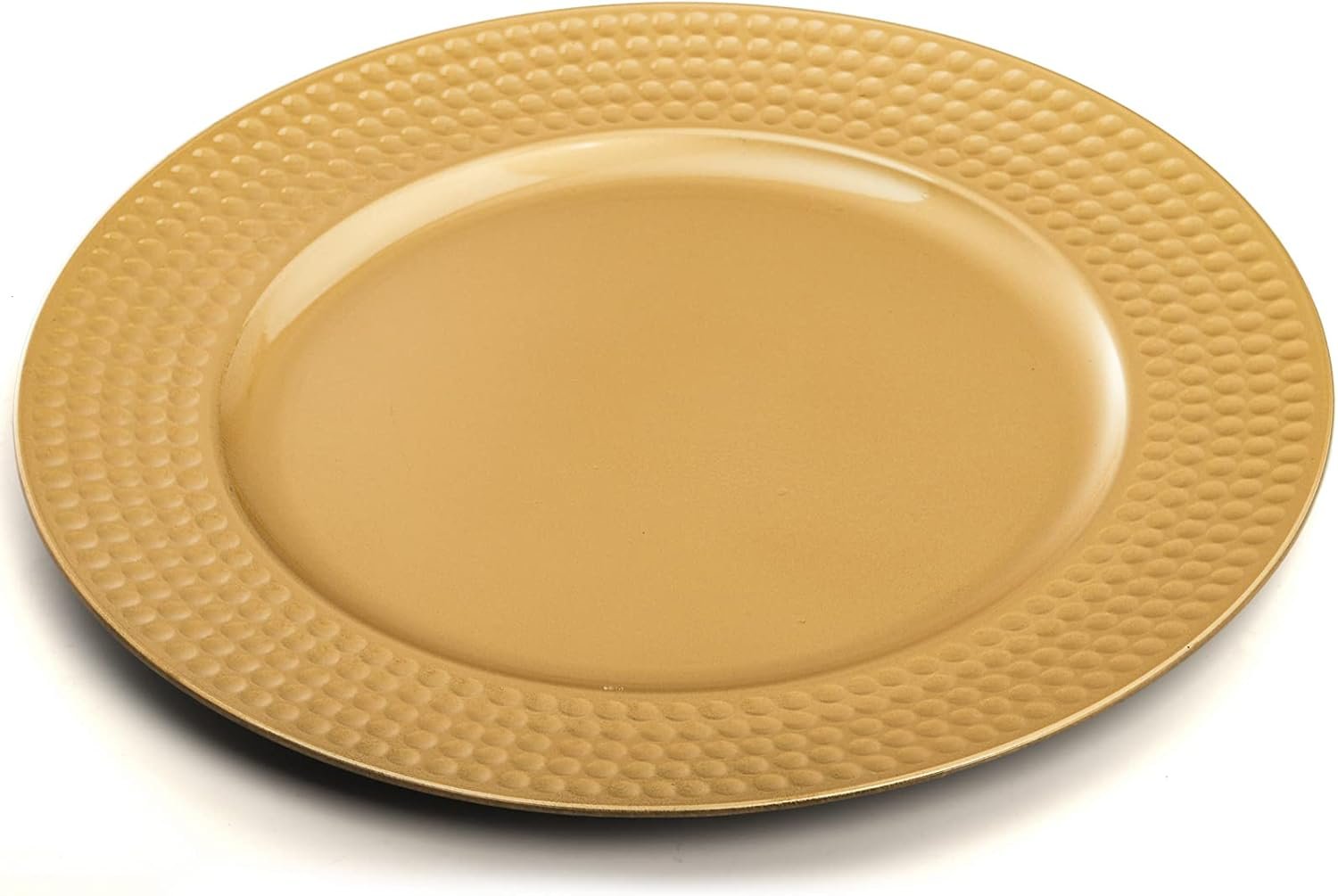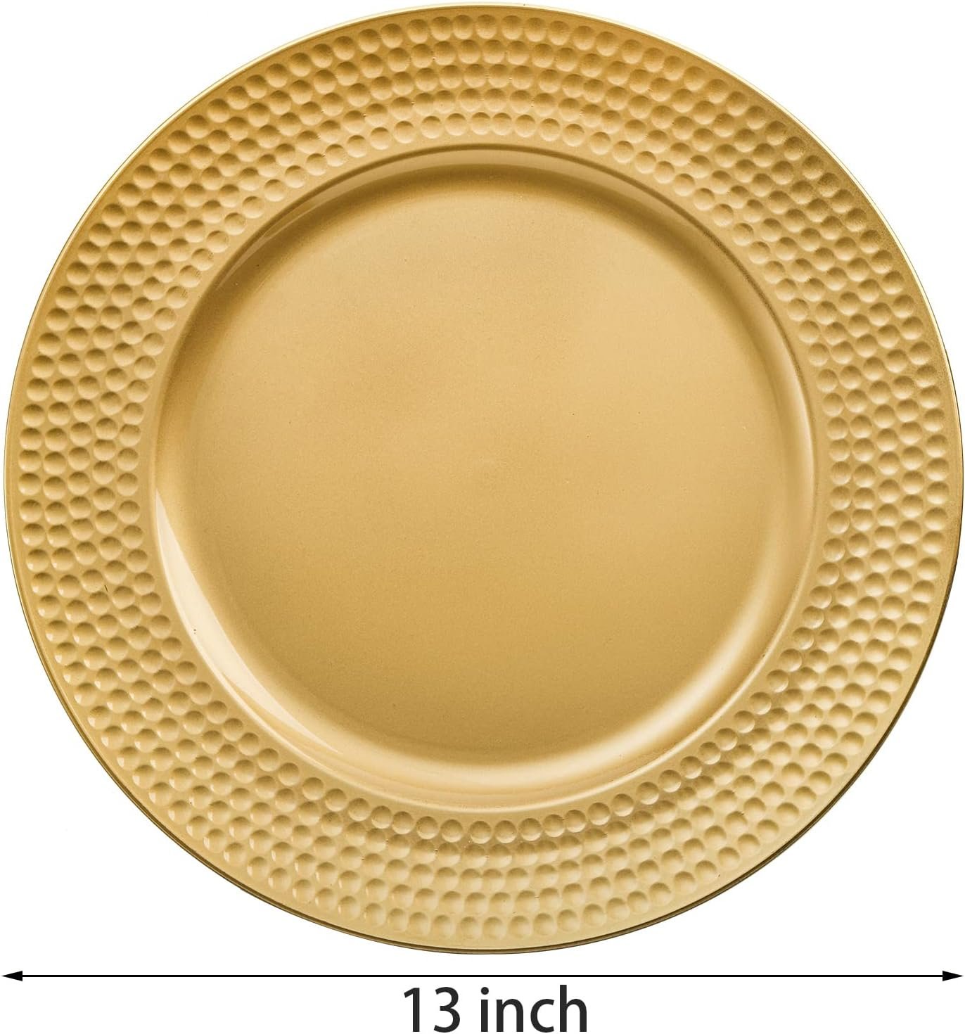 Wide application: gold charger plates are perfect for enhancing table settings at your banquets, weddings, party, catered event, restaurant, hotels, home, etc. Well-made & reusable: with fine work, plastic charger plate features the hammered rim design. It can add elegance and glamour to any tabletop.