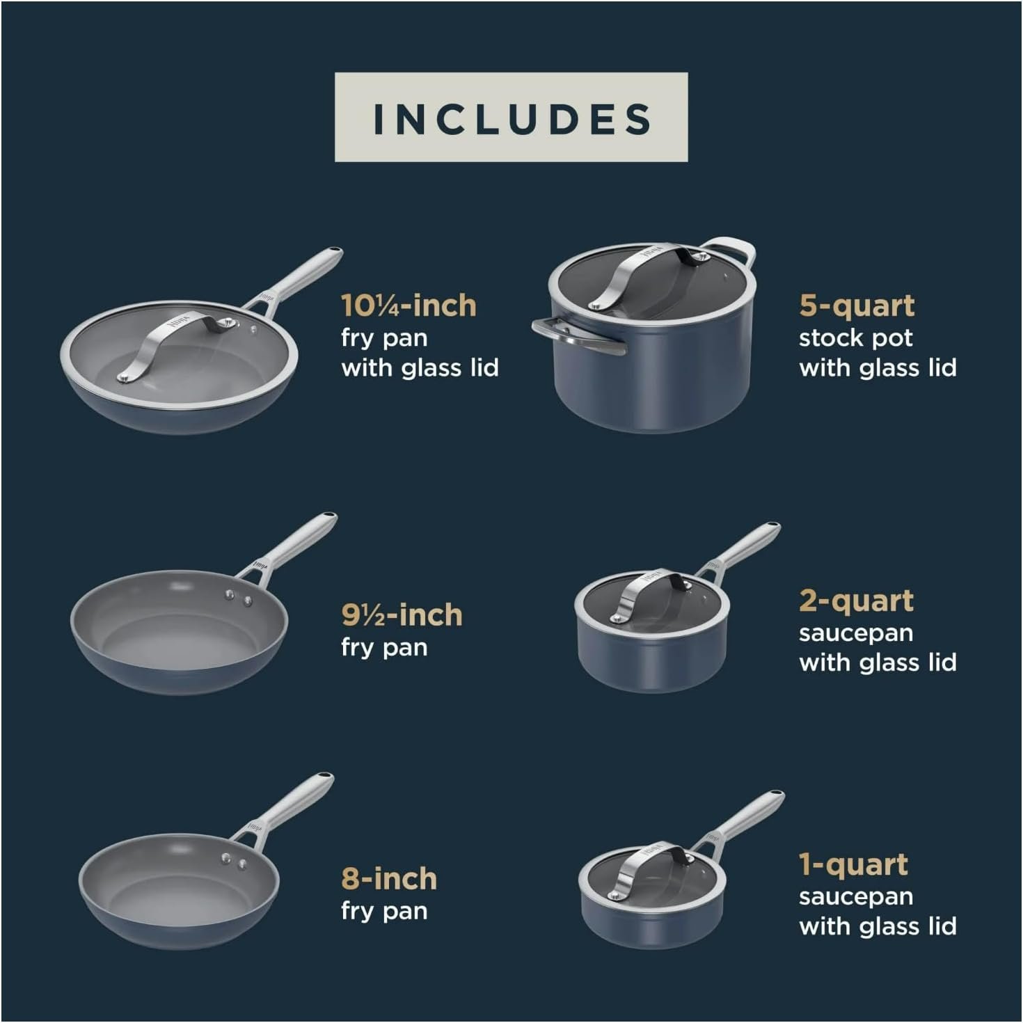 • 10-Piece Complete Set – Includes fry pans, saucepans with lids, and stockpot for all your cooking needs.