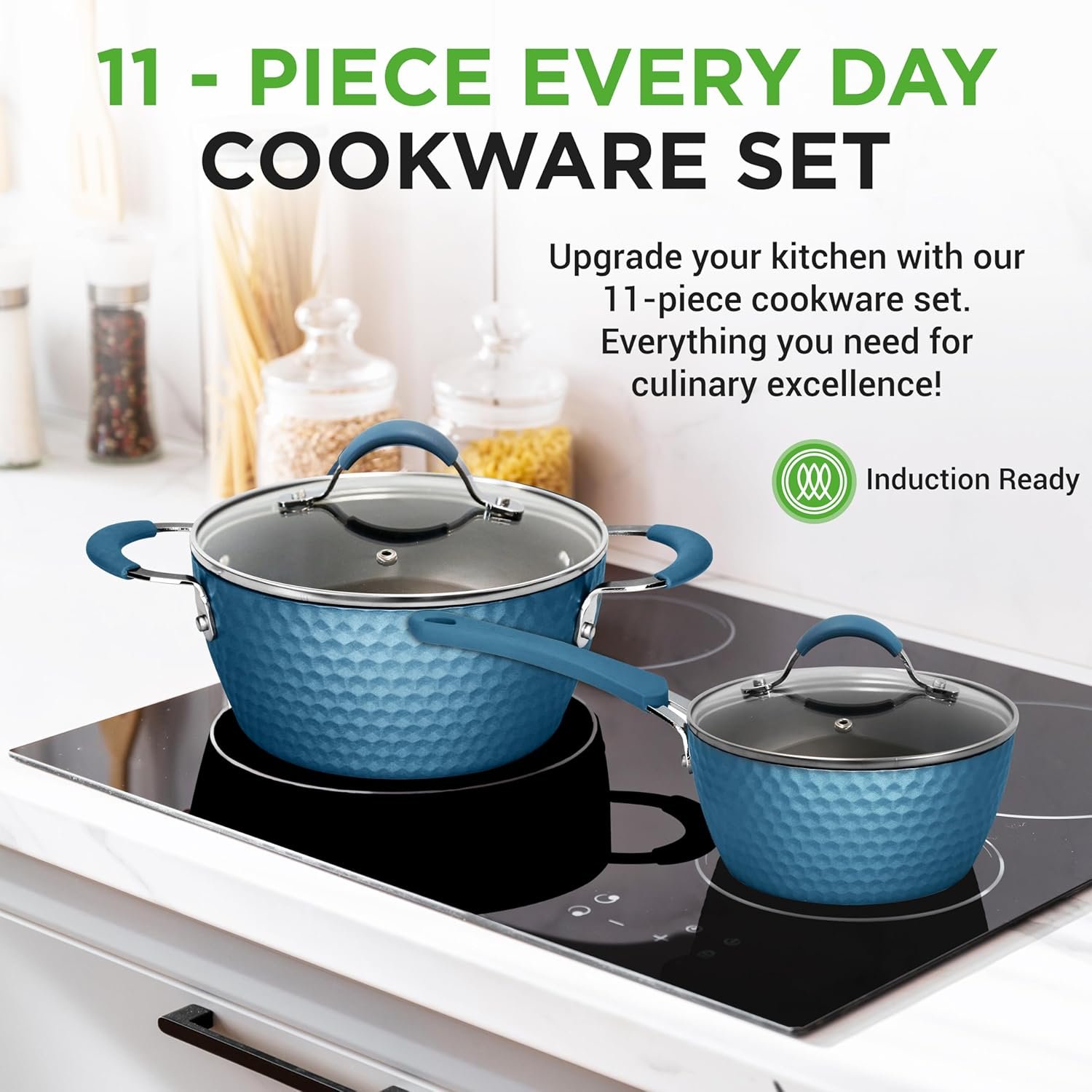 This 11-piece nonstick cookware set is designed to provide you with all the essential pots and pans you need for cooking. The set includes a 1.7qt saucepan pot with lid, 3.6qt dutch oven pot with lid, 2.1qt cooking pot with lid, 11” large fry pan, 8” small fry pan, soup ladle, pasta fork, and spatula.