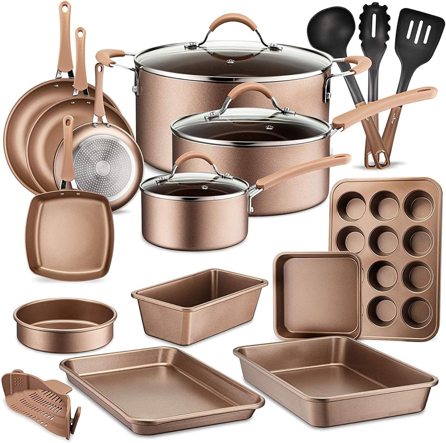 Home Kitchen Cookware Sets NutriChef Metallic Nonstick Ceramic Cooking Kitchen Cookware Pots and Pan Baking Set with Lids and Utensils, 20 Piece Set, Bronze (2 Pack)