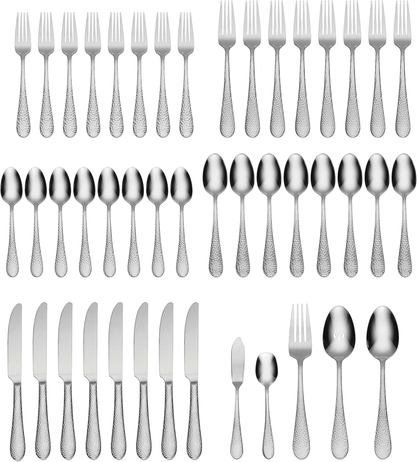 • Includes 8 dinner knives, 8 dinner forks, 8 salad forks, 8 dinner spoons, 8 teaspoons, 1 serving spoon, 1 pierced serving spoon, 1 sugar spoon, 1 butter knife, and 1 serving fork