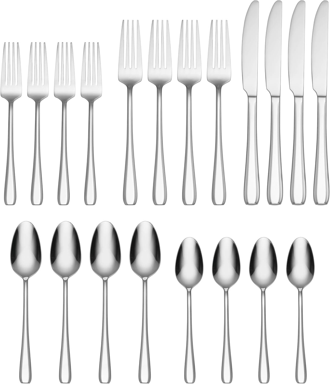 The Waverly 20 Piece Flatware Set is a casual yet classic addition to any dining setup, designed to elevate your table setting with its refined and freeing design. This set includes a comprehensive array of utensils: four dinner knives, four dinner forks, four salad forks, four dinner spoons, and four teaspoons, ensuring you are well-equipped for any meal.