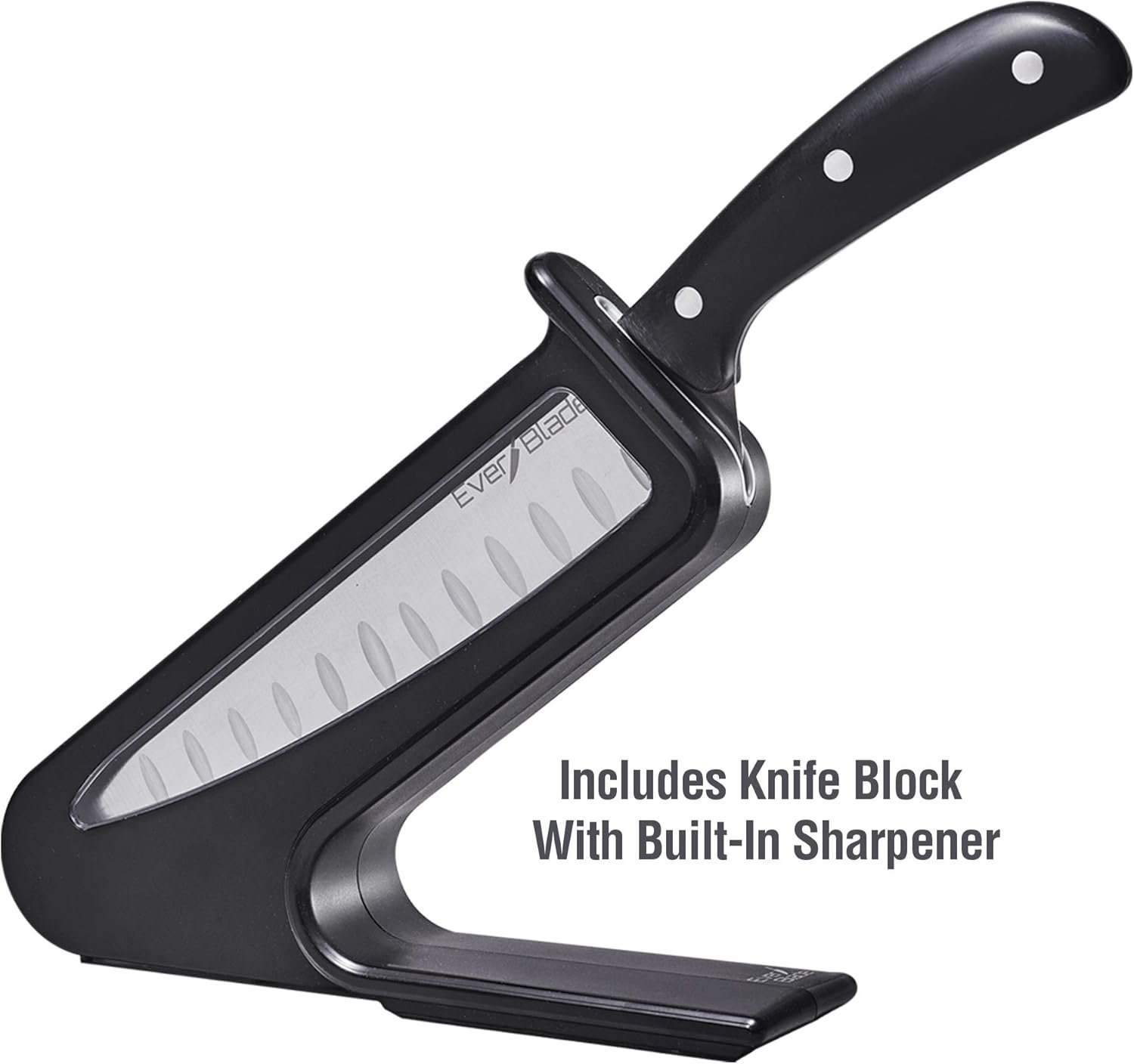 The EverBlade features a self-sharpening system, where the knife block hones the blade back to its original sharpness every time it is removed. The convex edge of the knife reduces resistance, allowing for easy slicing through various foods, from delicate tomatoes to tough butternut squash. The ergonomic design provides a comfortable grip, making it efficient for meal prep and everyday cooking.