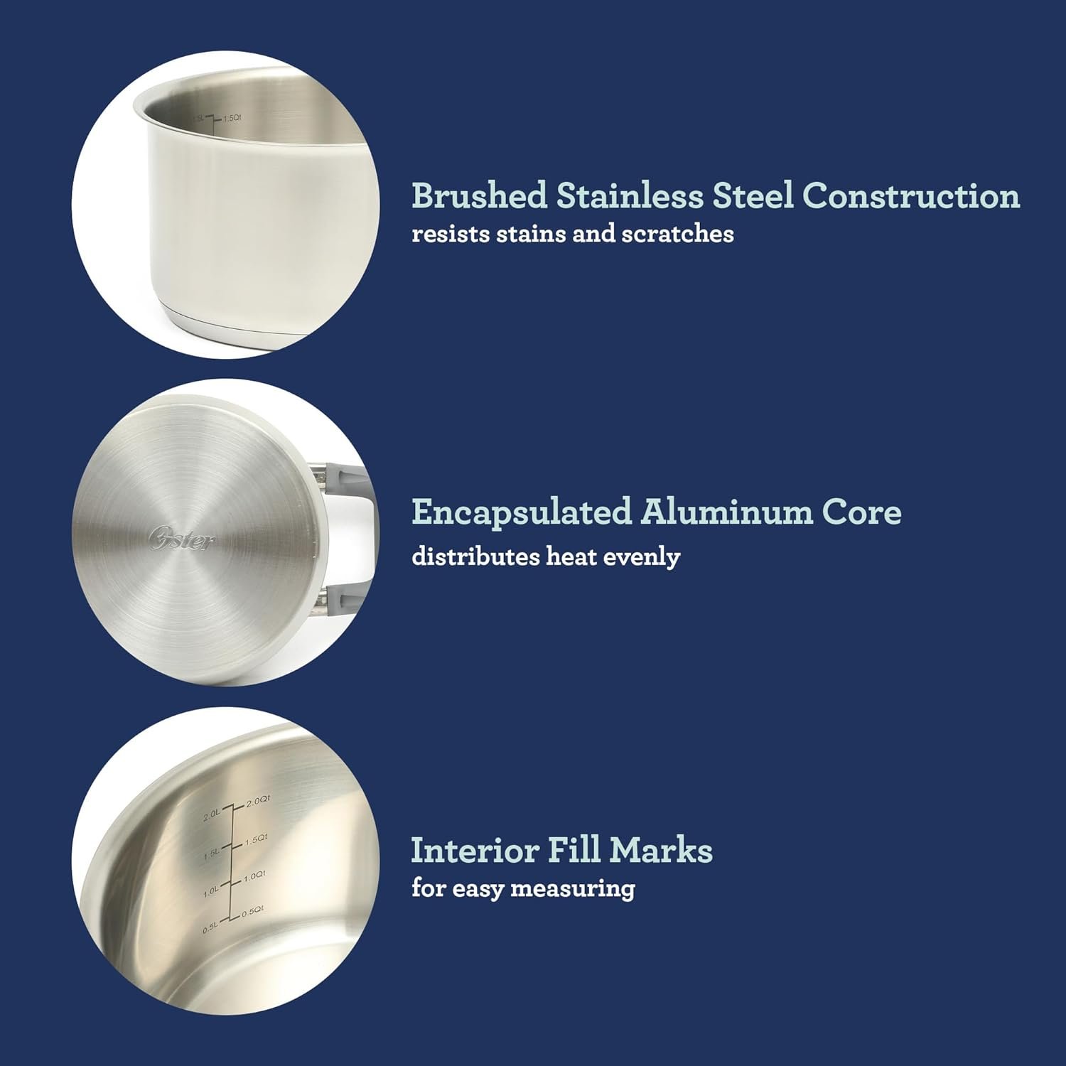 Whether a home chef needs to cook up a storm or put together a quick meal with 5 ingredients or less, the Oster Beauford Stainless Steel Cookware Set has the versatility and durability to deliver delicious results. These stainless steel pots and pans conduct heat and cook evenly – thanks to the encapsulated aluminum core – to serve the best and finest flavors and texture every time.