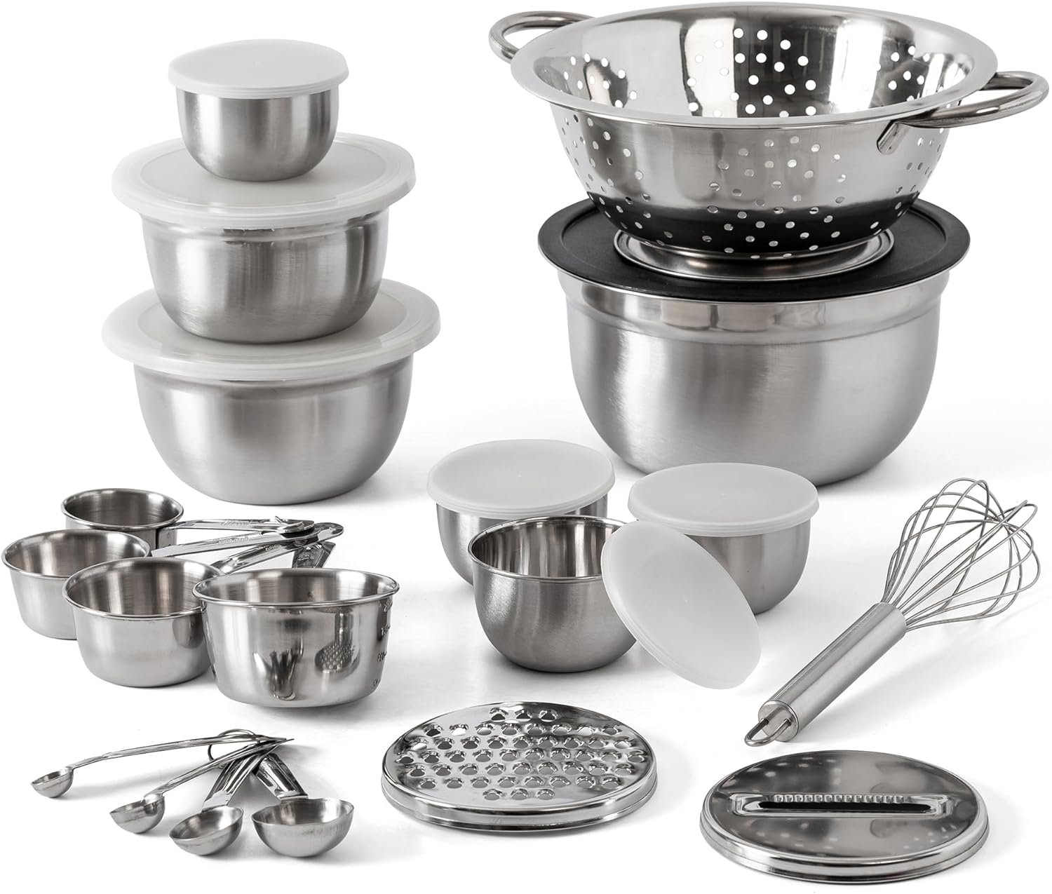 - 27-piece set including measuring spoons, measuring cups, prep bowls with lids, colander, inserts for grating and slicing, and balloon whisk