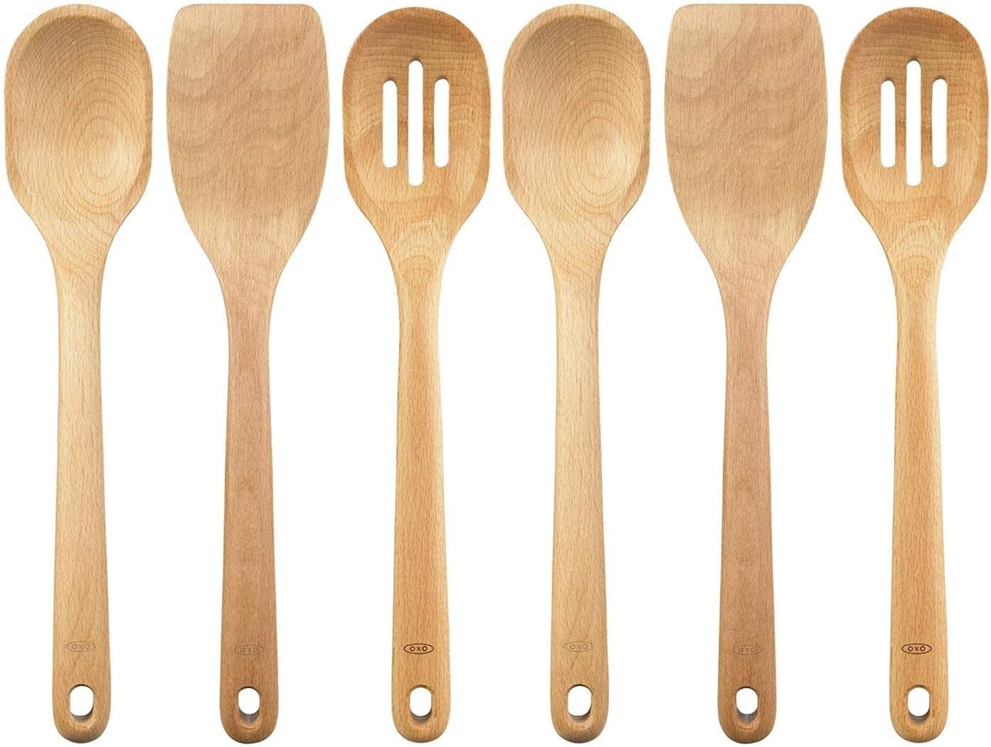 Get back to your roots with the OXO Good Grips Utensil Set, a 6-piece set of OXO wooden tools. Made of solid, one-piece beech wood, these sturdy wooden tools are comfortable, durable, and versatile. The set includes 2 OXO Wooden Large Spoons, 2 OXO Wooden Turners, and 2 OXO Wooden Slotted Spoons.