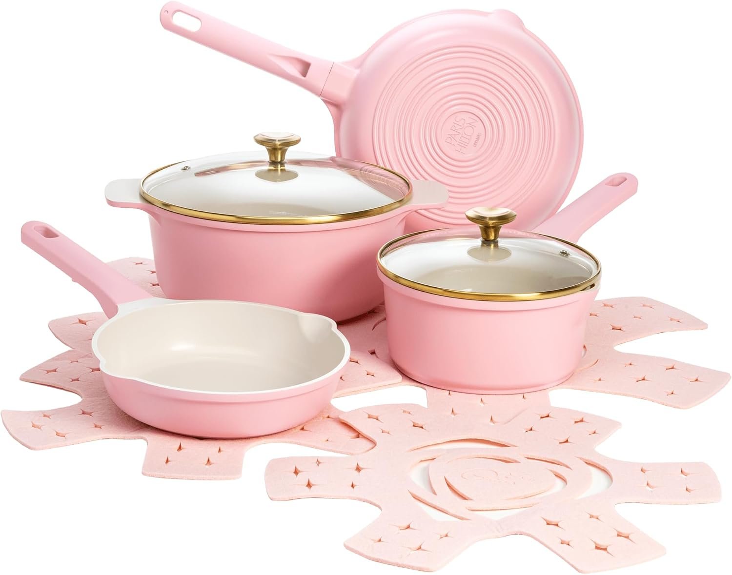 Paris-Hilton 10-Piece Nonstick Cast Aluminum Cookware Set with Ceramic Coating & Heart-Shaped Knobs – Durable, Easy-Clean Pots & Pans with Lids for Stylish Home Cooking (Pink)