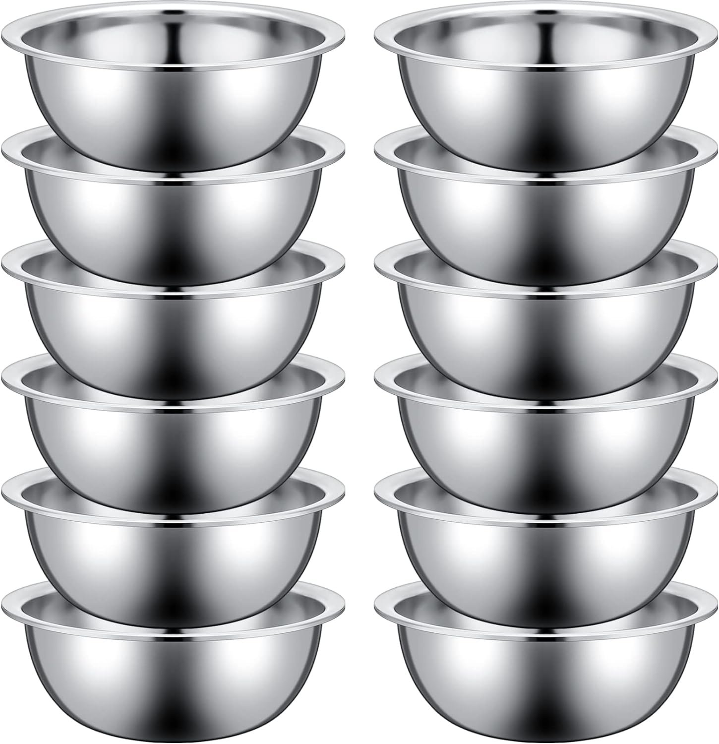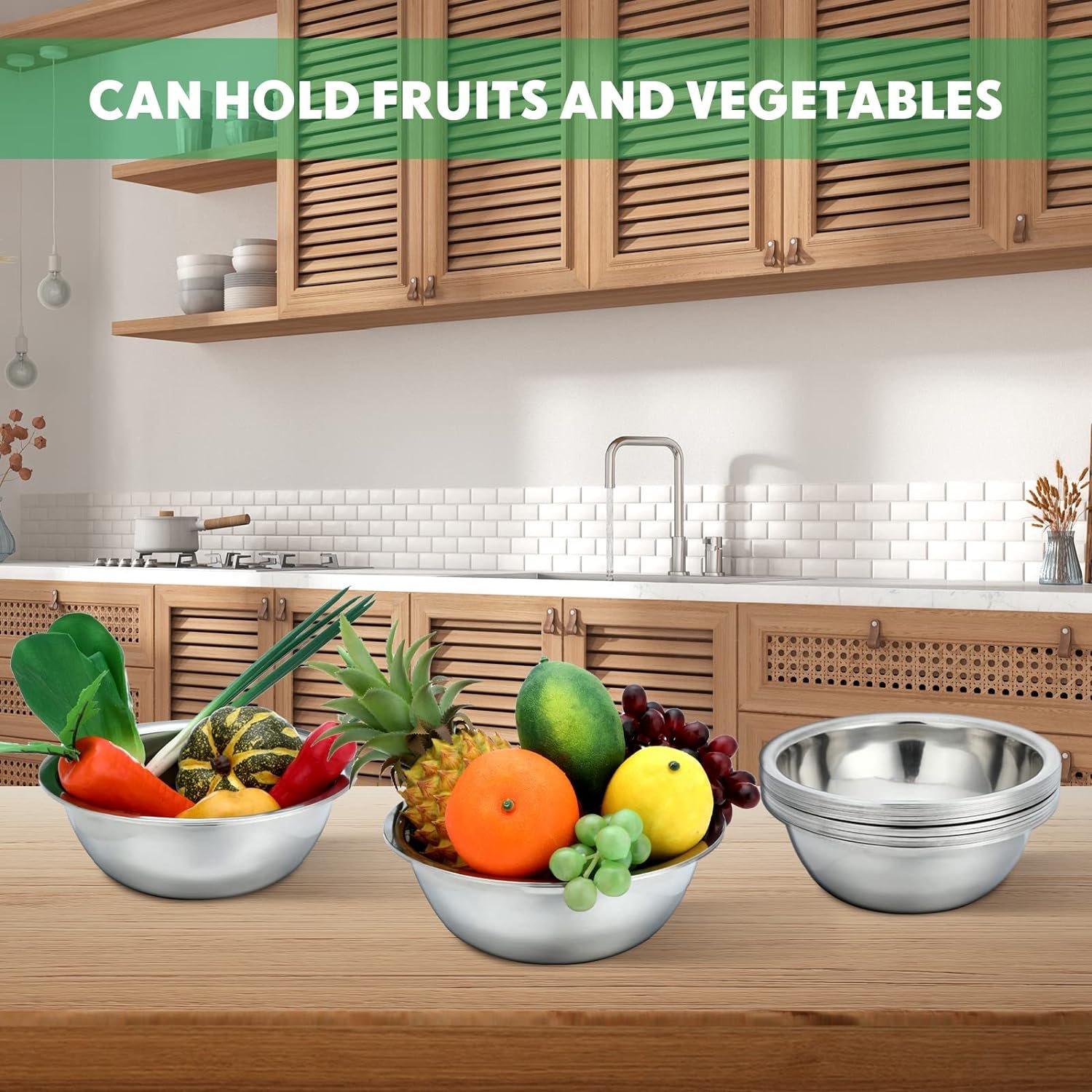 The Stainless Steel Mixing Bowl Set includes 12 pieces of stainless steel bowls in silver color, each measuring 8.66 x 8.66 x 3 Inches/ 22 x 22 x 7.7 cm. The set is suitable for daily use, replacement, and sharing. The stainless steel material is durable, reusable, and wear and tear resistant, making it a trustworthy choice for food preparation and serving. The nesting metal mixing bowls can be applied to mix salads, marinate meats, make sauces and dressings, and more, making it a versatile addition to any kitchen.