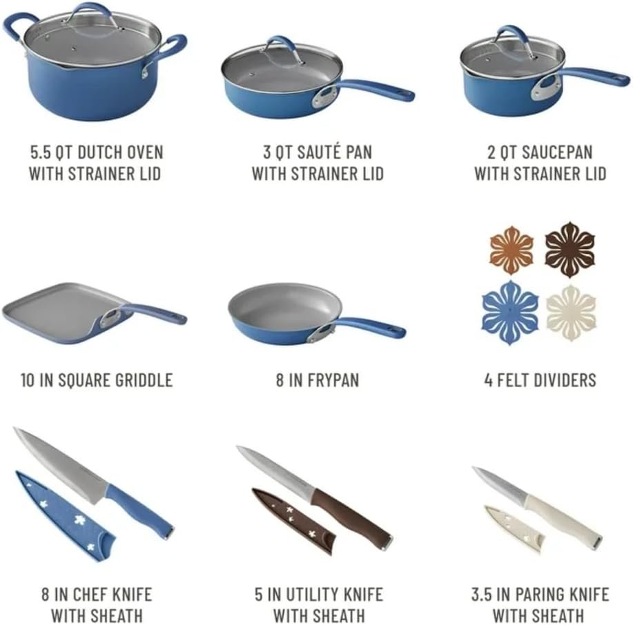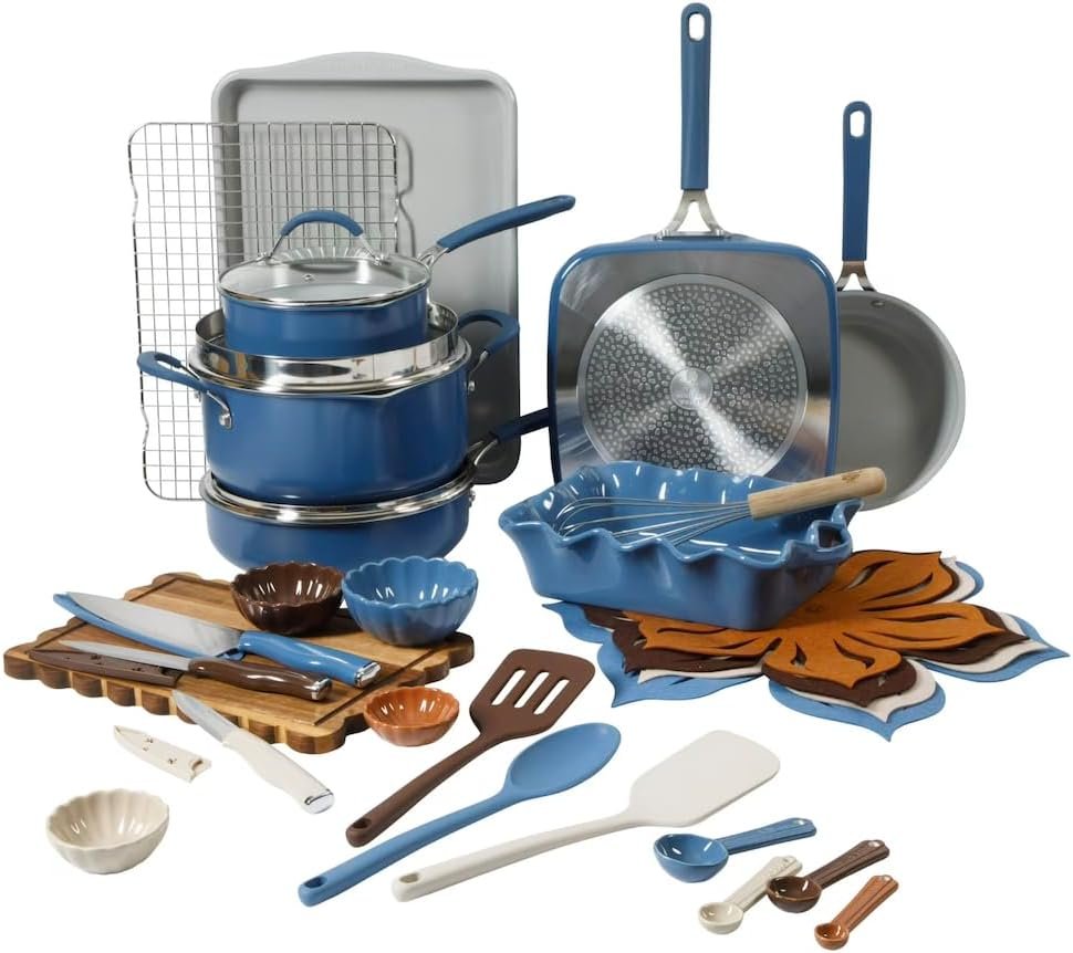 This 34-piece set in blue includes a saucepan, Dutch oven, sauté pan, fry pan, griddle, ceramic baker, bakeware, knives, and various utensils, providing everything you need for a variety of cooking tasks.