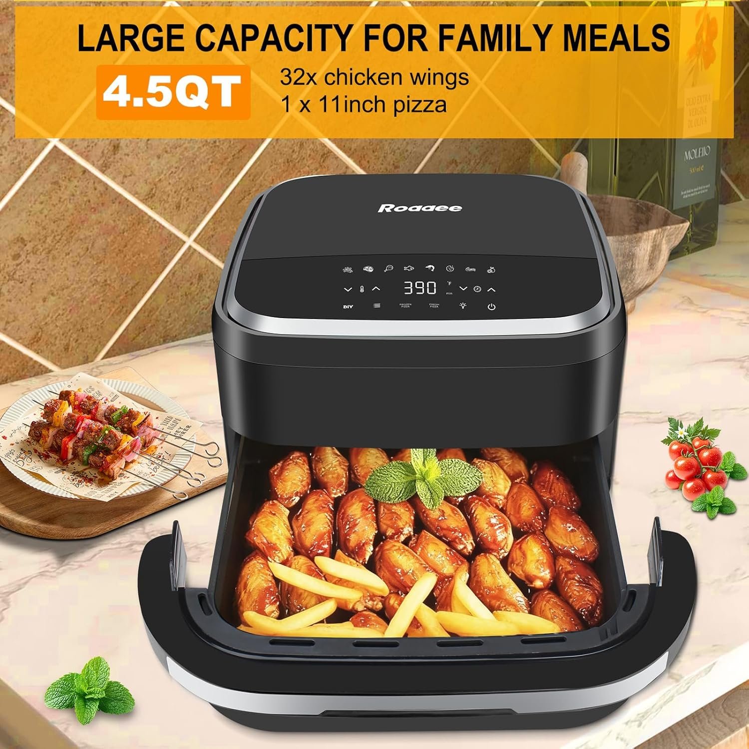 Home Fryers Pizza Oven & Air Fryer, 4.5QT 11-in-1 Flat Airfryer with Superior Top and Bottom Airflow Tech, Digital Display, Large Viewing Window, Grill Plate, Up to 32 Chicken Wings / 11″ Pizza Capacity