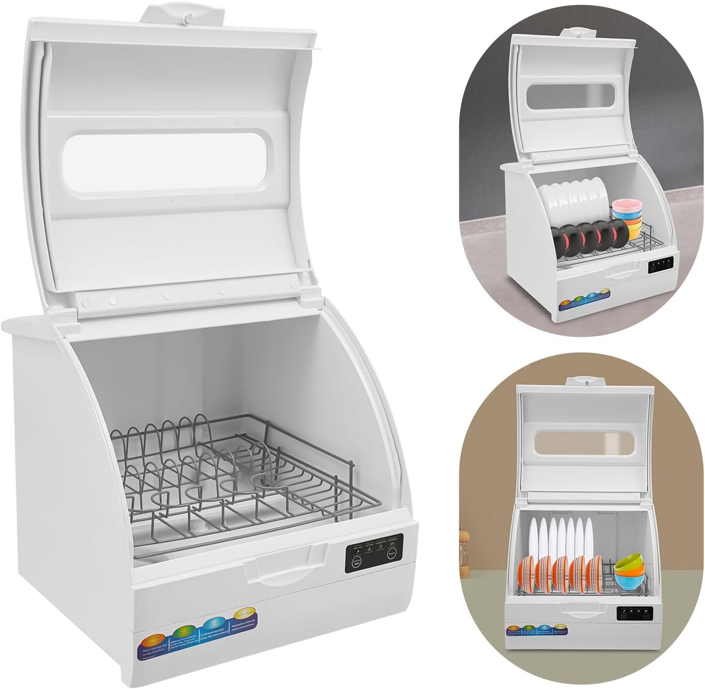 This product is a compact, countertop dishwasher designed to meet the daily needs of a family of 4-5 people. It is ideal for small houses, flats, boats, campervans/caravans, home kitchens, and more. The dishwasher can be used for washing dishes, plates, knives, forks, spoons, chopsticks, cups, and other tableware. It serves not only as a dishwasher but also as a dryer and a dish storage cabinet.