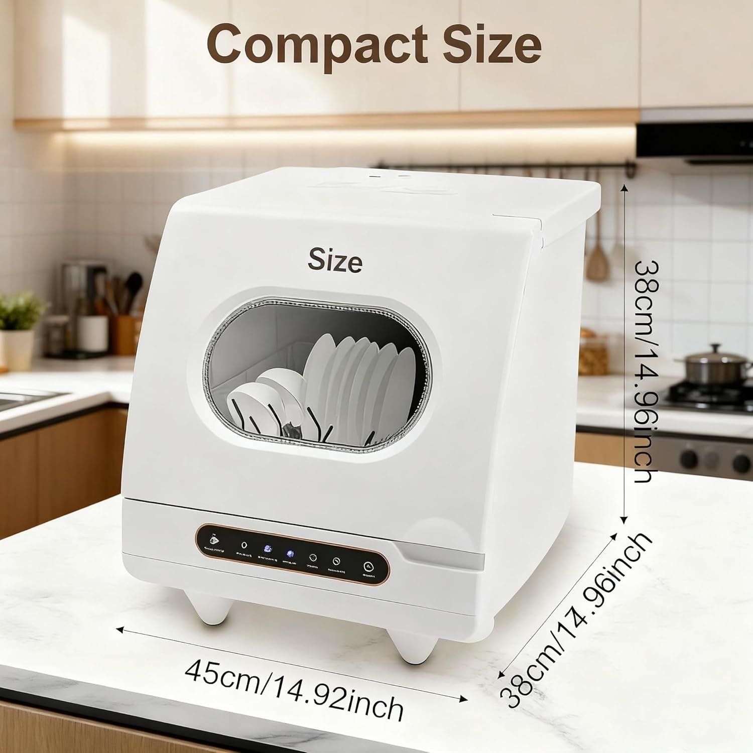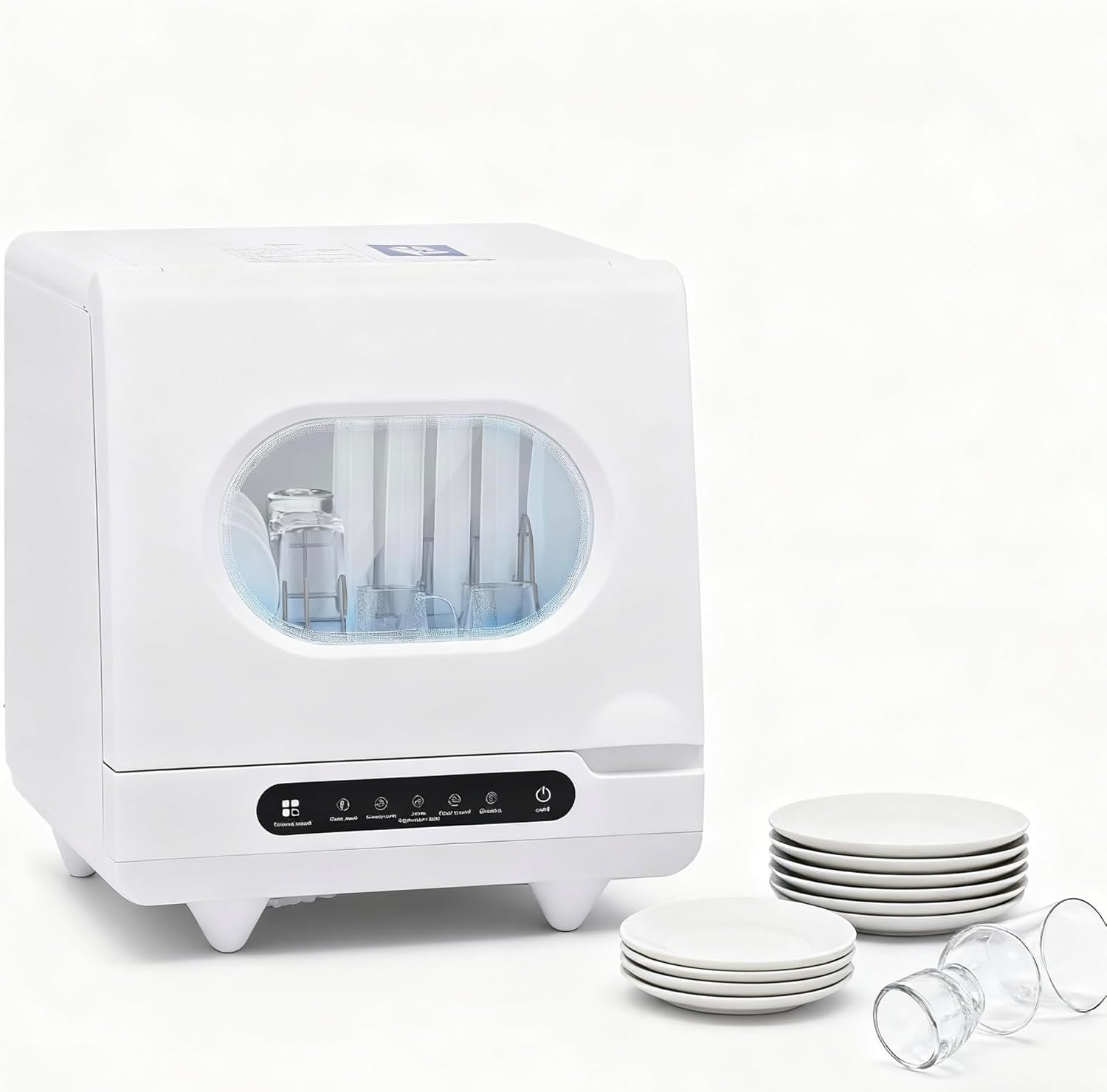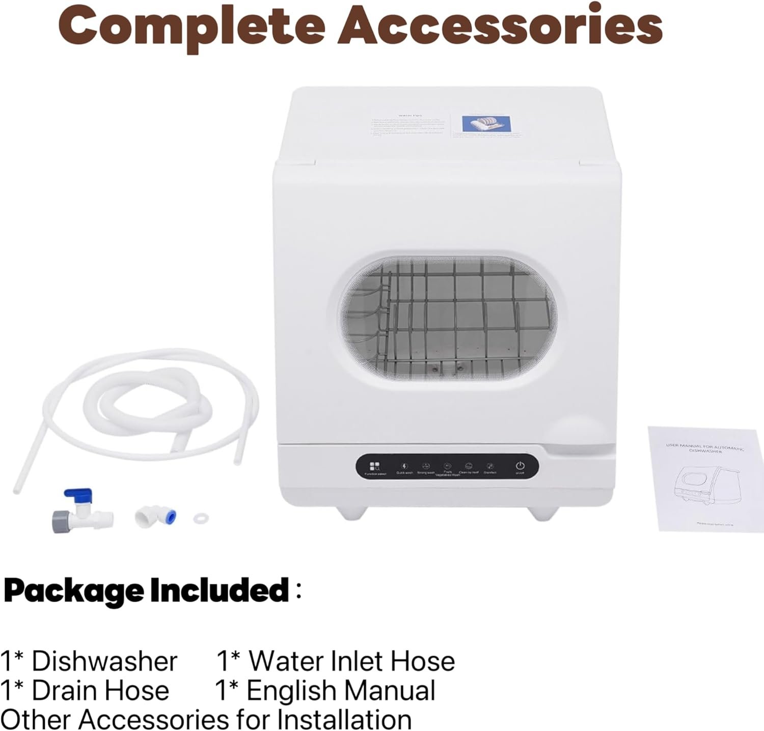 This countertop dishwasher is designed with a thoughtful design, featuring a self-cleaning mode system that can soften water quality and prevent dirt from remaining inside the machine. The detachable filter makes it convenient for you to handle food residues. The automatic water replenishment and drainage function saves you time. The magnetic induction front cover adopts an upward-flipping design, with an ergonomic groove at the bottom for convenient manual opening and closing. The integrated design requires no complex installation, and it’s ready for use after connecting the power supply and water pipe. The package contains everything you need to get started, including a dishwasher, water inlet hose, drain hose, and English manual. You can easily turn the machine on and off and switch the cleaning mode by operating the intelligent touch buttons according to the user manual.