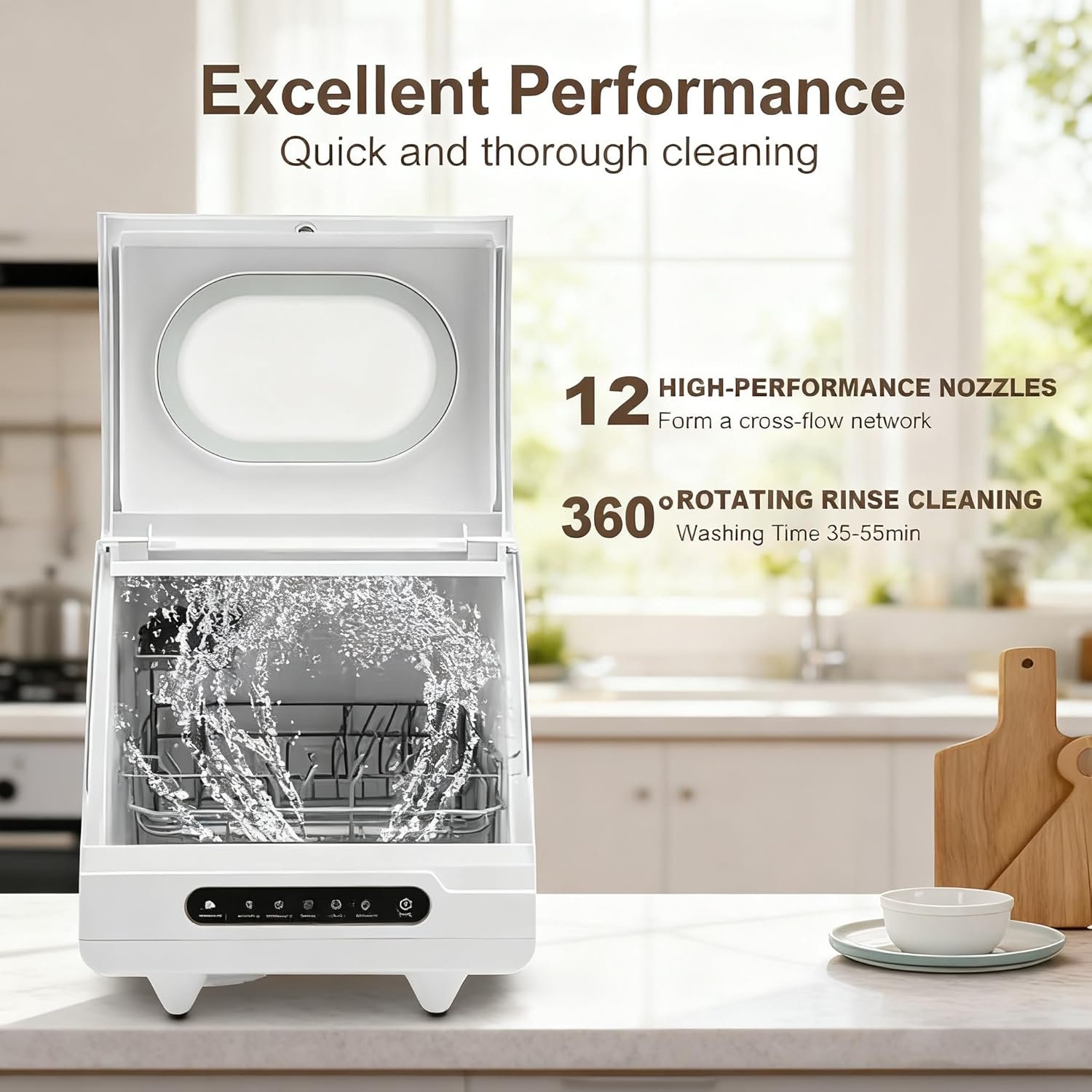 Our dishwasher features 5 intelligent washing functions, providing you with more personalized washing services to meet different cleaning needs. The high-temperature cleaning at 161.6℉ combined with a 360° rotating spray can more effectively remove grease and dirt from tableware, making it cleaner and more hygienic. It is compact in size, doesn’t take up much kitchen space, and can wash 6 sets of tableware at a time. The maximum water consumption is approximately 1.32 gallons, which is more water-efficient than traditional hand washing. The dishwasher is equipped with a high-quality stainless steel frame, which is wear-resistant, heat-resistant, and has a long service life. The 800W pure copper motor ensures cleaning efficiency while effectively reducing operating noise (55dB), creating a quiet and comfortable kitchen environment.