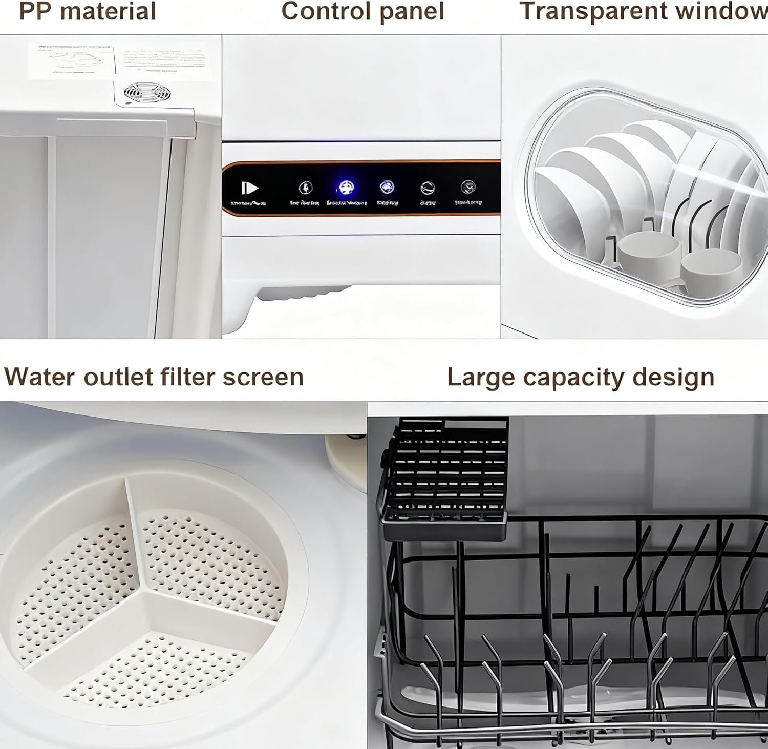 The countertop dishwasher features a flip-up lid with magnetic induction and a groove below, making it easy to open and close by hand. The middle of the lid has a transparent design, allowing you to see the working status and progress of the dishwasher at a glance. It also has a removable and washable internal filter for easy disposal of food scraps.